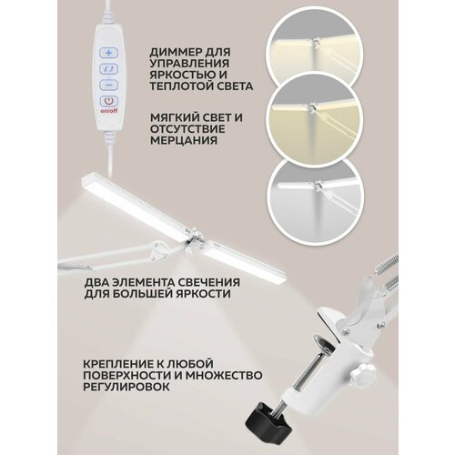 Поддерживает разные режимы: теплый, дневной и холодный, что делает его подходящим для различных задач, включая процедуры по наращиванию ресниц или татуажу. Его длинная диодная панель создаёт равномерный свет, который будет полезен для занятий вышивкой, шитьём, рисованием или даже ухода за рассадой.