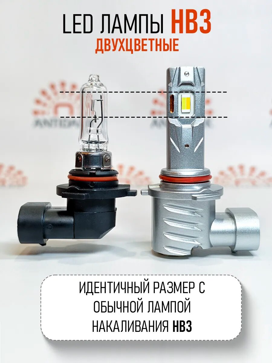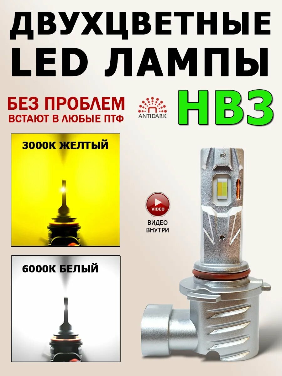 Эти двухцветные светодиодные лампы HB3 от компании "Antidark" предназначены для использования в ПТФ и обеспечивают яркое и качественное освещение дороги в любую погоду, не бояться пыли и влаги, не создают помехи радиоприемнику.