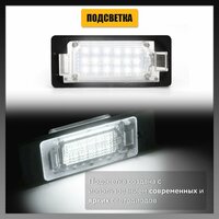 Совместима с бортовым компьютером. Совместима с оригинальным разъёмом, подключается без дополнительных переделок. В одном плафоне используется 24 LED светодиодов. В комплект входят 2 плафона светодиодной подсветки номерного знака.