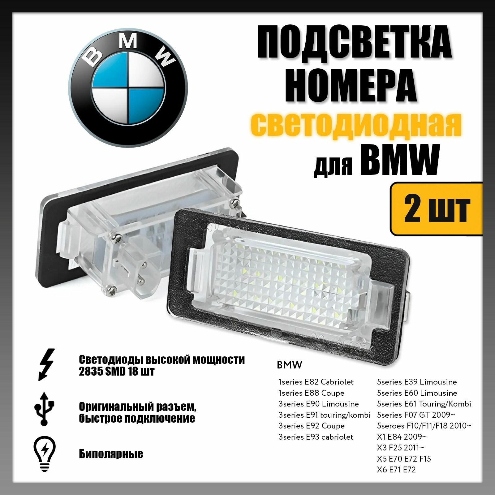 LED подсветка номера BMW Серия 1,3,5 Х1-Х6 светодиодная 2шт OEM 63267165646: сравнение цен, характеристики, фото, актуальное наличие и цены.