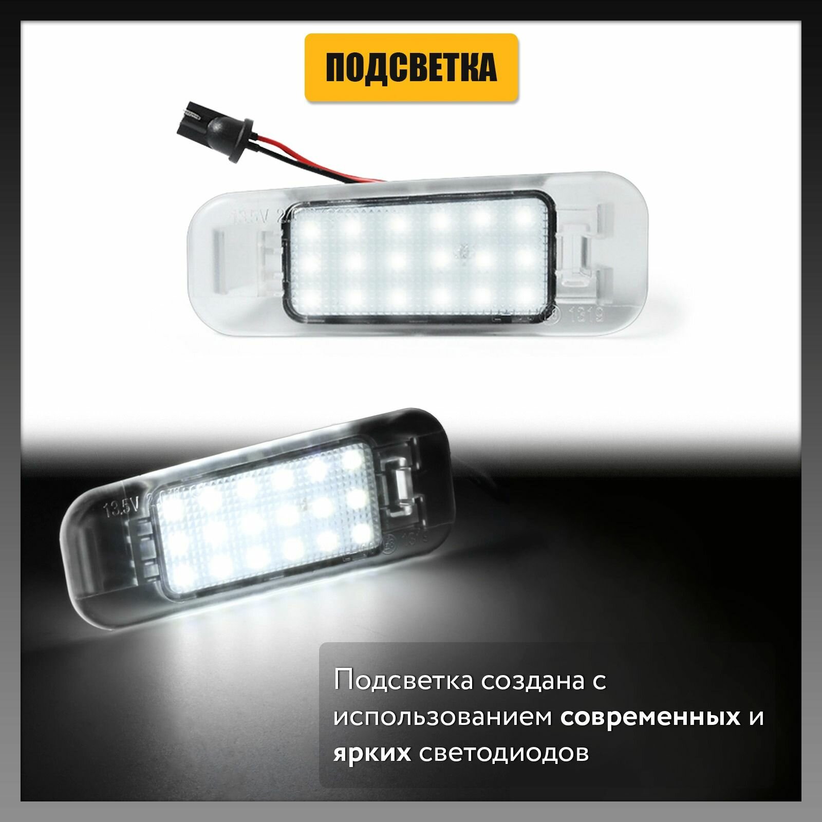 Совместима с бортовым компьютером. Совместима с оригинальным разъёмом, подключается без дополнительных переделок. В одном плафоне используется 18 LED светодиодов. В комплект входят 2 плафона светодиодной подсветки номерного знака.