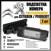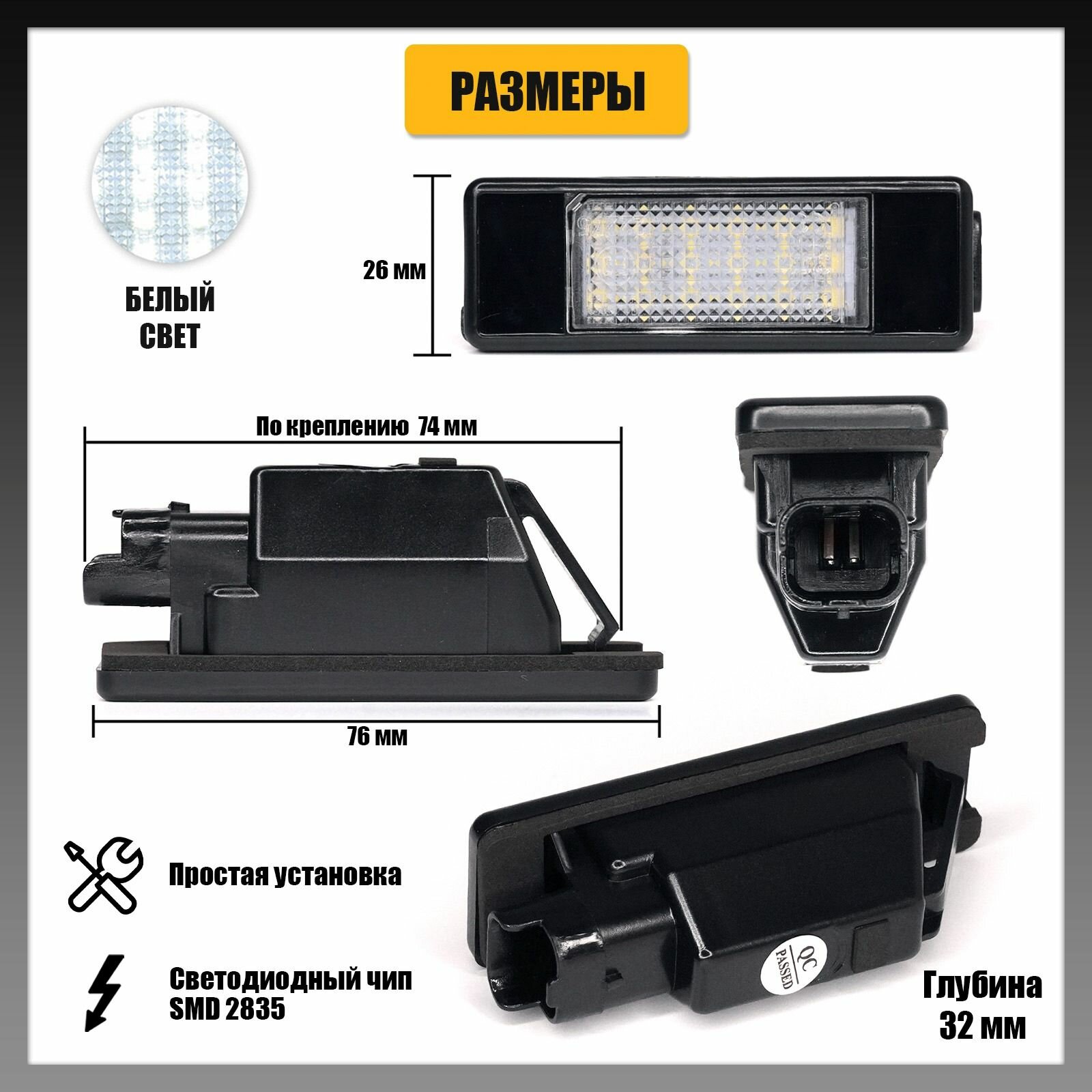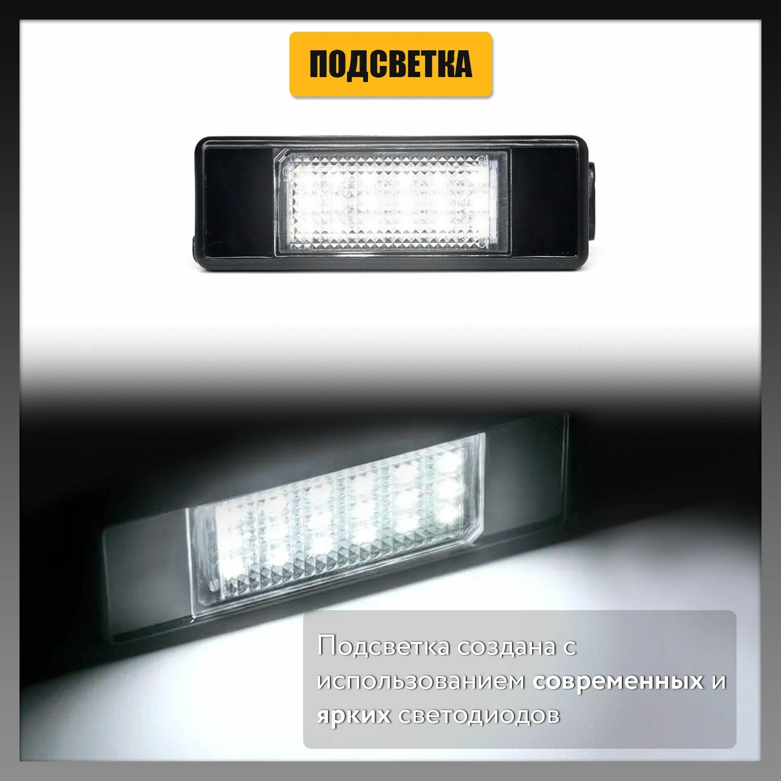 Совместима с бортовым компьютером. Совместима с оригинальным разъёмом, подключается без дополнительных переделок. В одном плафоне используется 18 LED светодиодов. В комплект входят 2 плафона светодиодной подсветки номерного знака.