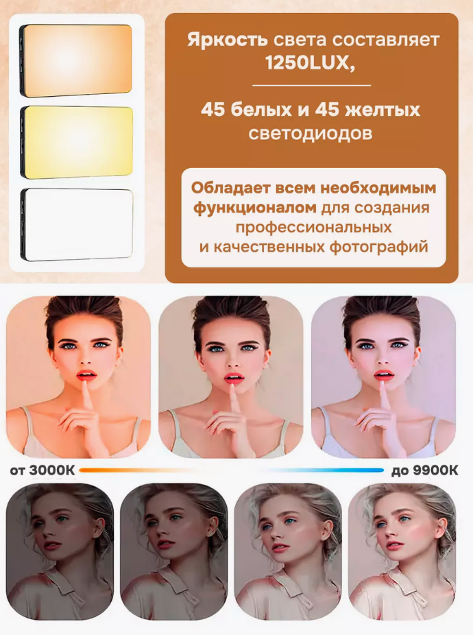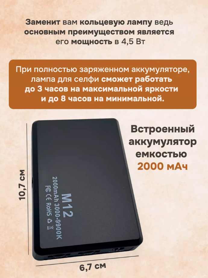 Купить Видеосвет M12 для фото и видео, 90 LED, 1250LUX, Type-C, 2000 мАч, крепление в комплекте с доставкой по всей России.