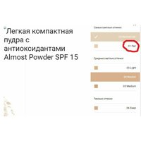 | Способ применения | Всего одно прикосновение спонжа для пудры, и эта формула выровняет тон кожи и скроет ее недостатки. Almost Powder Makeup SPF 15 создает совершенно естественное покрытие, маскирующее красноту и неровную пигментацию. Almost Powder Makeup SPF 15 - пото- и влагостойкая формула. Чтобы покрытие получилось более прозрачным и легким, наносите формулу спонжем для пудры. Almost Powder Makeup SPF 15 обеспечивает в течение дня защиту кожи от опасных солнечных лучей. |