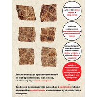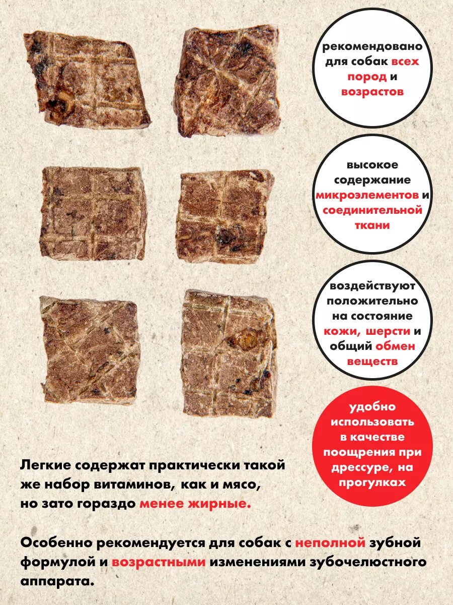 Лакомства для собак, кошек и грызунов. Порезанные кусочки высушенного говяжьего легкого. Высокое содержание микроэлементов и соединительной ткани дополняет удовольствие собаки от нежного лакомства. Легкие очень вкусны, малокалорийны и замечательно усваиваются организмом. Легкие содержат практически такой же набор витаминов, как и мясо, но зато гораздо менее жирные. Оказывают положительное воздействие на состояние кожи, шерсти и общий обмен веществ. Кусочки очень удобно использовать в качестве поощрения при дрессуре, и просто на прогулках. Для собак всех пород и возрастов. Особенно рекомендуется для собак с неполной зубной формулой и возрастными изменениями зубочелюстного аппарата. Благодаря вкусовым качествам и воздушной структуре является одним из самых любимых лакомств для наших четвероногих друзей.