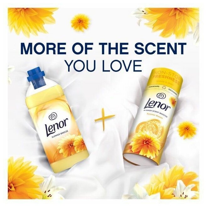 Откройте для себя духи для стирки белья Lenor, средство для усиления запаха gосле стирки, последнее рождение хорошего самочувствия Lenor. Чтобы обеспечить непрекращающуюся свежесть до 12 недель хранения, Lenor наполнит вашу одежду ароматом Summer Breeze. Окутанный тонким ароматом жасмина в сочетании со свежей сочной дыней, представьте себе успокаивающие прикосновения солнечных лучей к вашей коже! Усилители аромата Lenor Summer Breeze In-Wash были созданы для идеальной гармонии со смягчителем Lenor Summer Breeze. Попробуйте их вместе, чтобы получить больше аромата, который вам нравится!