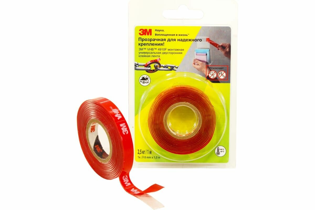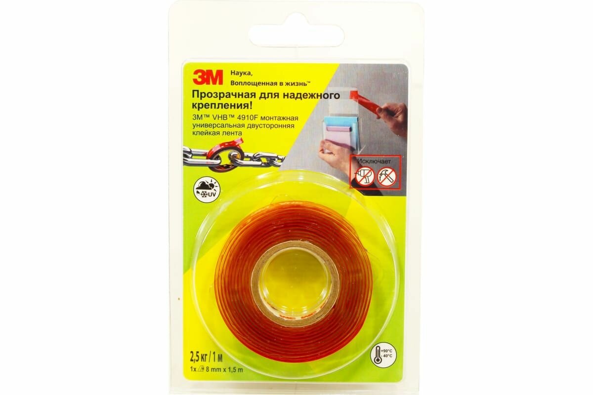Прозрачная универсальная лента 3М 4910F 8 мм x 1,5 м РОЗ подходит для внутреннего и наружного промышленного применения с самыми разнообразными поверхностями, включая загрунтованное дерево, большинство пластиков, композитов и металлов.