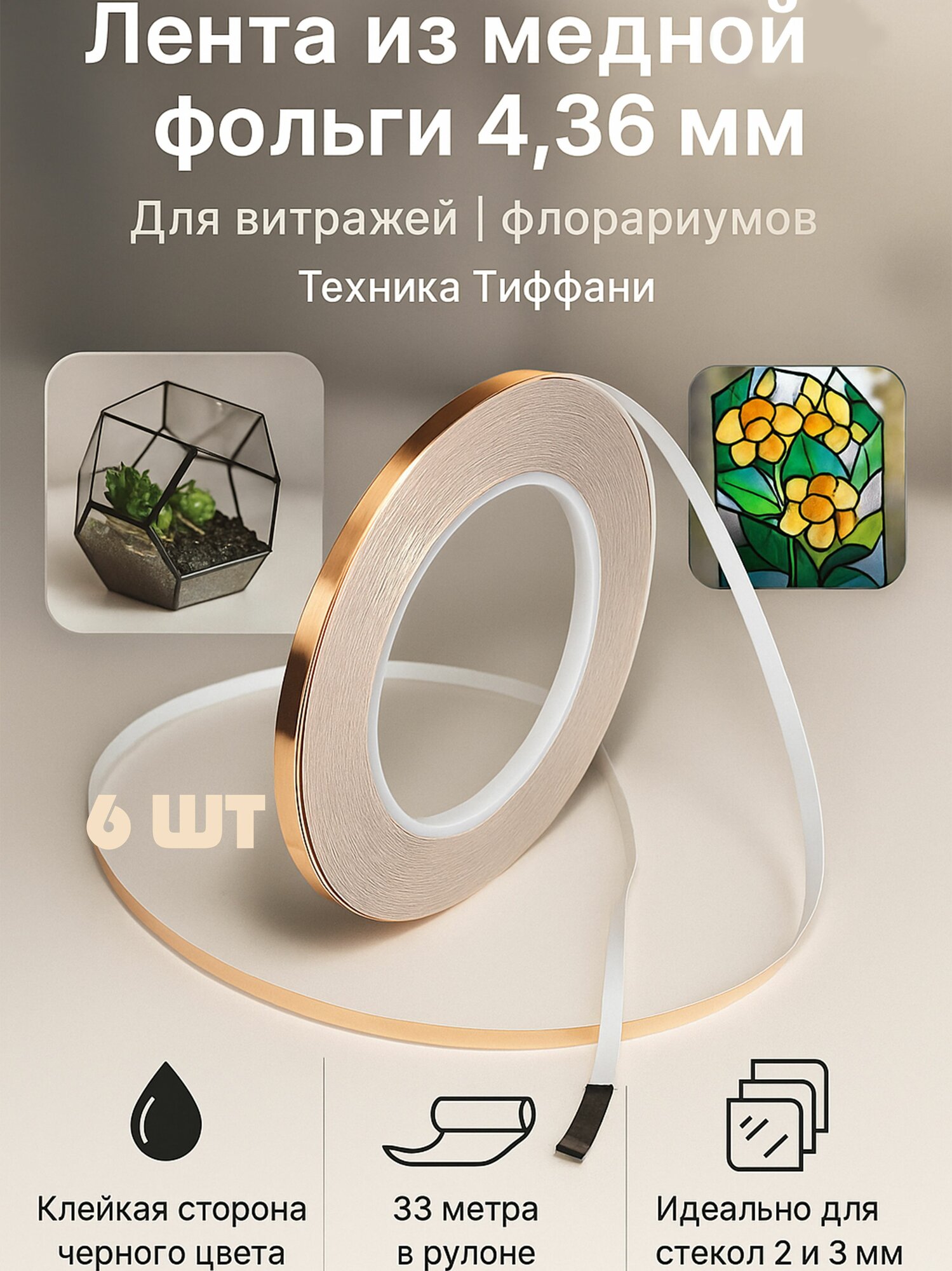 Лента из медной фольги 4.36 мм 33 м 6шт для витражей и флорариумов: сравнение цен, характеристики, фото, актуальное наличие и цены.