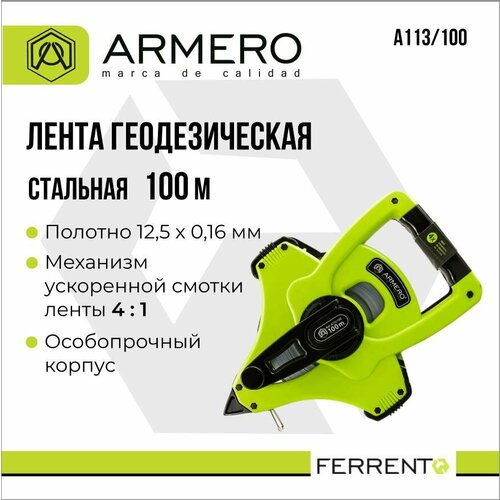 Лента измерительная стальная ARMERO А113/100 длинной 100м, с усиленным металлическим полотном и шириной полотна 12,5 мм с износостойким полиамидным покрытием II класса точности, сертифицированный MID CE, в закрытом корпусе из высокопрочного ABS пластика с интегрированными противоударными прорезиненными вставками. Снабжена механизмом смотки полотна с передаточным соотношением 4:1.