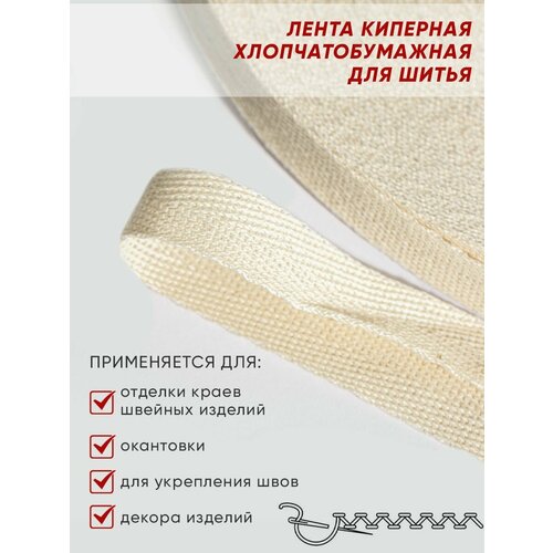 Киперная лента – это плотная лента саржевого переплетения из натурального 100% хлопка. Саржевое переплетение придает этой тесьме особую прочность. Киперную тесьму используют при пошиве униформы, спецодежды, верхней одежды, при производстве пледов, покрывал, сумок, рюкзаков, головных уборов.