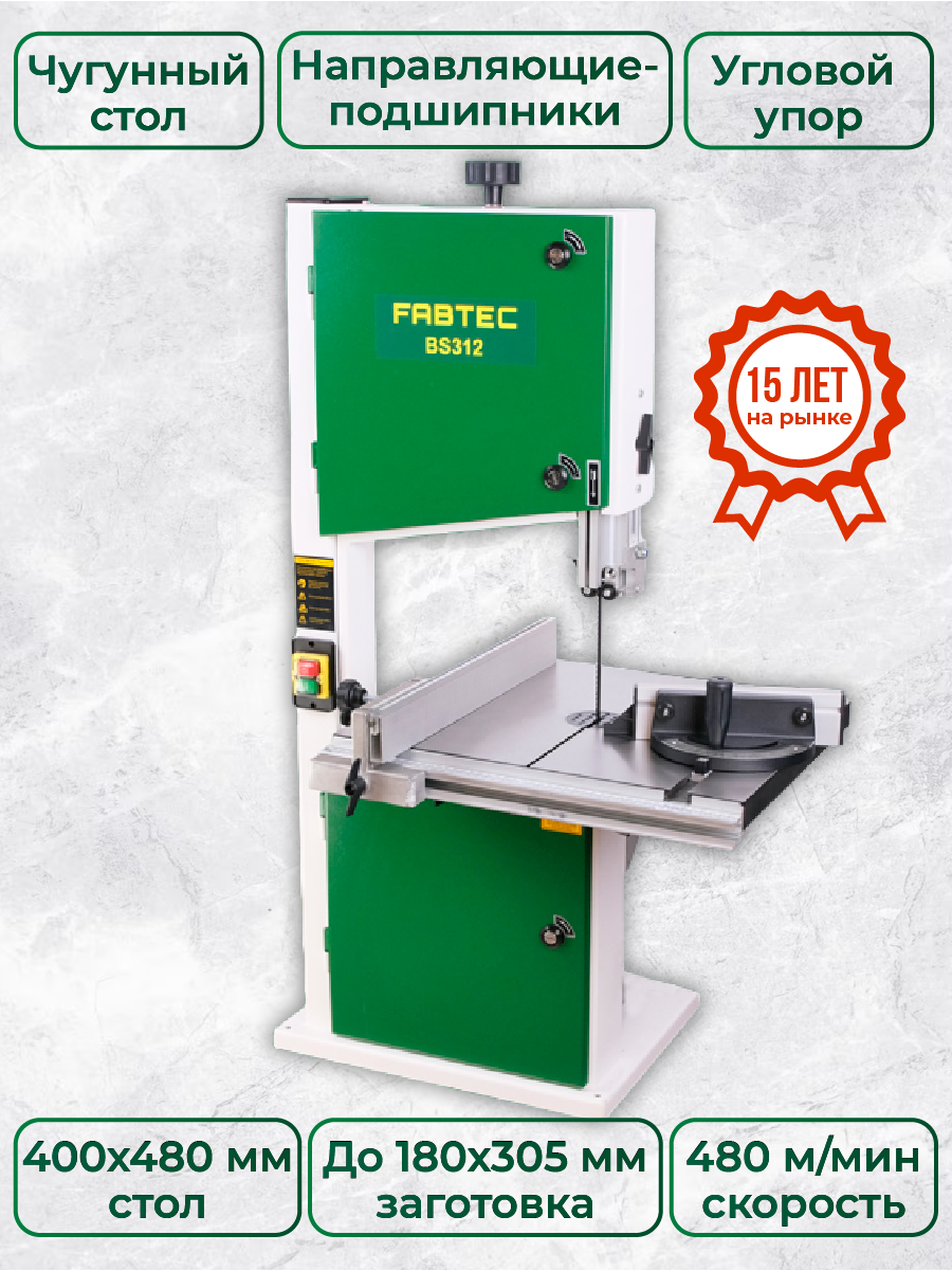 Вертикальная ленточная пила FABTEC BS312 предназначена для распила деревянных или пластиковых изделий. Эта пила будет чувствовать себя уверенно в частной мастерской или небольшом производстве, где работают с небольшими и средними заготовками; BS312 относится к категории полупрофессиональных пил, у нее солидная высота пропила - 180мм, 2 скорости подачи пильного полотна 400 и 480м/мин, а также чугунный стол; Пила позволяет уверенно работать, как с мягкими породами древесины, так и с твердыми (дуб, ясень, орех и т. д.); Для распила заготовок под углом, рабочий стол имеет возможность наклона, а так в комплекте с пилой угловой упор. Вес пилы в 60кг положительно сказывается на жесткости конструкции, если есть необходимость ее можно передвинуть в одиночку или перевести в автомобиле (предварительно сняв стол). Рекомендации по применению: Компактная ленточная пила по дереву FABTEC BS312 идеально подходит для индивидуальной мастерской. Основные характеристики: Страна-производитель: КНР Макс. высота заготовки: 180 мм Макс. ширина заготовки (просвет до рамы): 305 мм Размер стола: 400х480 мм Длина ленточного полотна: 2240 мм Ширина ленточного полотна: 6-15 мм Скорость подачи ленты: 400 или 480 м/мин Высота стола: 1000 (470 без подставки) мм Угол наклона рабочего стола: 0º - 45 ° Диаметр шкивов: 312 мм Если вы пользовались или ищете ленточнопильный станок JET BELMASH Zitrek, вы также сможете по достоинству оценить качество ленточных пил по дереву от компании FABTEC