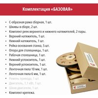 С-образная рама сборная, 1 шт; колёса в сборе, 2 шт; комплект реек верхнего и нижнего натяжителей, 2 пары; верхний натяжитель, 1 шт; нижний натяжитель, 1 шт; рейка основания станка, 5 шт; опора для столешницы, 1 шт; рабочая столешница, 1 шт; нижний успокоитель, 1 шт; верхний успокоитель, 1 шт; пильное полотно 6 мм, 1 шт; пильное полотно 10 мм, 1 шт; комплект крепежа.