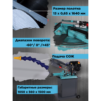 Ленточнопильный станок AURA TOOLS LM-128SHD/220 отличается высокой производительностью. Корпус станка изготовлен из литого чугуна. Предусмотрен поворот пильного узла для резки под углами в диапазоне от -45° (влево) до +60° (вправо). Заготовка фиксируется в регулируемых, быстрозажимных тисках. Скорость опускания пильного узла (скорость подачи) изменяется с помощью регулятора гидроцилиндра. Данный станок, в отличии от схожих моделей других производителей, оснащён системой подачи СОЖ в зону резания. Скорость движения ленточного полотна регулируется посредствам перестановки ремней. Станок комплектуется большим основанием-тумбой, оборудованной колесами для большей мобильности в цеху. Размер ленточного полотна для данной модели 13 x 0,65 x 1640 мм. Шаг полотна подбирается исходя из разрезаемого материала.