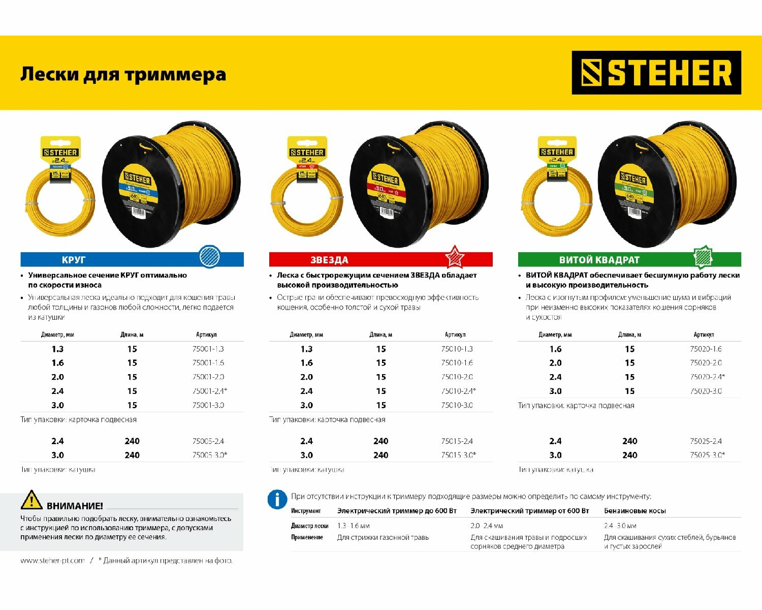 Купить Леска для триммера круг 2.4 мм 240 м STEHER (75005-2.4) с доставкой по всей России. Леска для триммера круг 2.4 мм 240 м STEHER (75005-2.4): сравнение цен, характеристики, фото, актуальное наличие и цены.