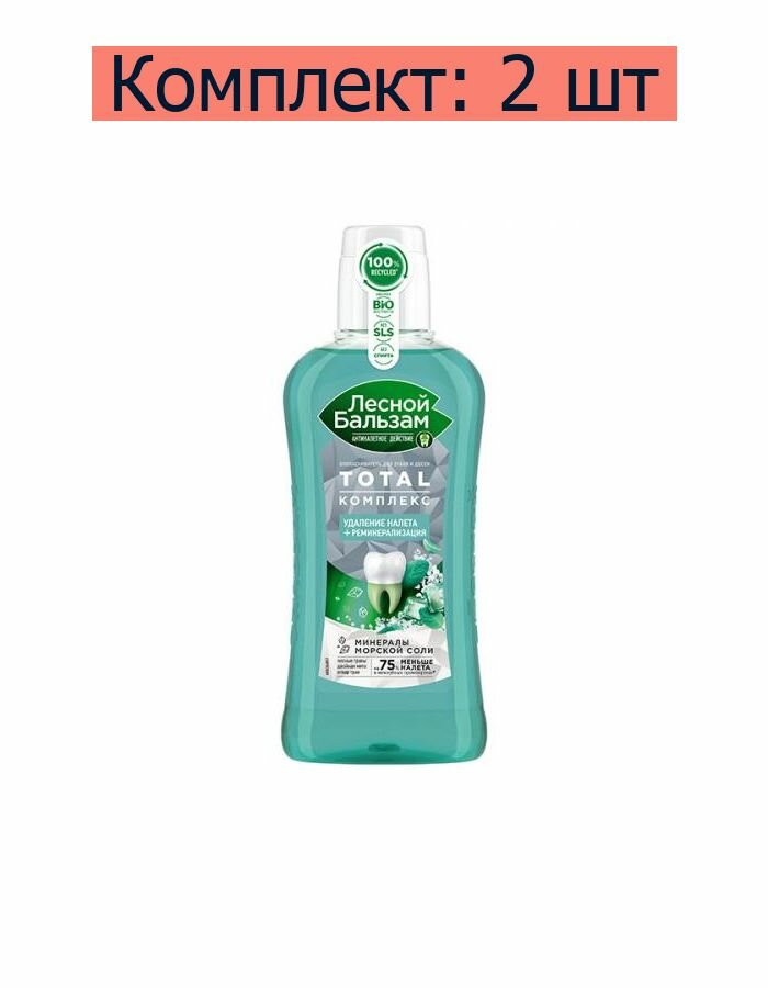 Лесной бальзам Ополаскиватель для полости рта с морской солью, мятой и травами, 400 мл. Ополаскиватель для комплексной защиты зубов и десен – Лесной бальзам Total Комплекс с морской солью, маслом мяты и экстрактами лесных трав. Формула ополаскивателя борется с первопричиной развития серьезных проблем полости рта – зубным налетом, который вызывает кариес, влияет на изменение цвета зубов, приводит к образованию зубного камня и кровоточивости десен. Формула усилена минеральными компонентами и экстрактами трав. Не содержит парабенов и спирта и рекомендована стоматологами для ежедневного использования. В составе 98% ингредиентов натурального происхождения. Клинически доказано: на 75% меньше налета в межзубных промежутках. Ополаскиватель Лесной бальзам Total Комплекс также подходит для усиления гигиены полости рта при ношении брекетов или съемных зубных протезов. Обеспечивает дополнительную защиту от развития кариесогенной микрофлоры и защищает от развития локальных очагов воспаления. Флакон ополаскивателя на 100% сделан из переработанного пластика.