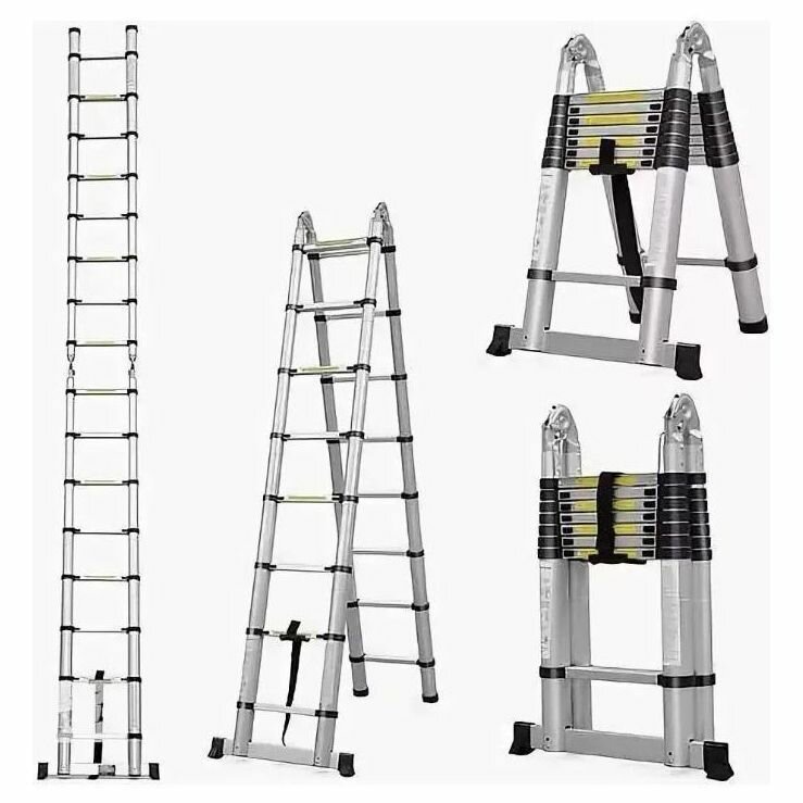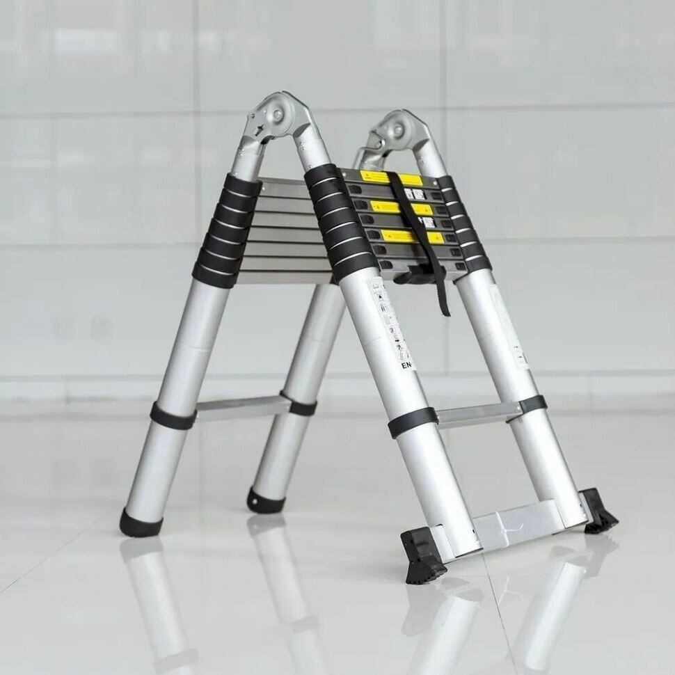 Лестница изготовлена из алюминия, замки обеспечивают надежную фиксацию лестницы при использовании.