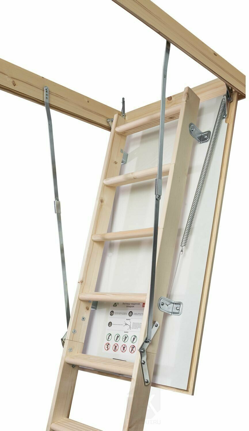 Лестница PROF 36 обеспечивает легкий, комфортный подъем на верхние этажи частных домов, загородных коттеджей и дач. В изготовлении лестницы используется дерево хвойных пород. Лестница оснащена двусторонним белым люком, который практически не заметен на потолке. В случае необходимости крышку люка можно перекрасить в любой другой, подходящий для интерьера цвет. Лестница выдерживает нагрузку до 150 кг, при этом сама она легкая - ее просто складывать и раскладывать одним касанием руки. Несмотря на простоту, она оснащена поворотным замком, надежно фиксирующим люк в закрытом состоянии. Лестница соответствует всем техническим и европейским нормам безопасности EN 14975. Лестница полностью готова к сборке. Подходит для самостоятельного монтажа.