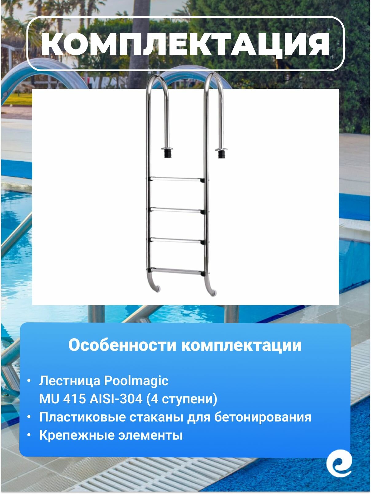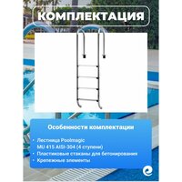 | Комплектация | Лестница для бассейна Poolmagic LF 515 5 ступеней; Пластиковые стаканы для бетонирования; Крепежные элементы |