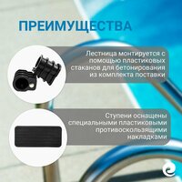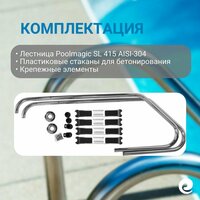 | Комплектация | Лестница Poolmagic MU 415 AISI-304 (4 ступени); Пластиковые стаканы для бетонирования; Крепежные элементы |