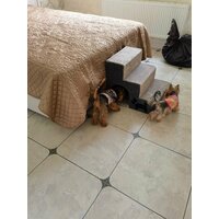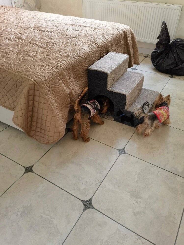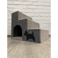Ступеньки с уютным домиком внутри для маленькой собачки. Вход в дом с одной стороны (см. фото). Внутри домика все детали зашиваются ковролином паласного типа. Никаких «голых» досок. Размер входа в домик 22*22 см. Лесенка полностью выполнена из ДСП. Прослужит Вашему хвостику не один год. Очень прочная и надежная. Тяжелая. Не скользит по полу. Выдержит песика любого веса. Обшиты ступеньки ковролином с ворсом. Он более прочный, износостойкий материал, нежели мех, ткань, например. Размеры: 55*44*46 -(длина*ширина*высота). Глубина каждой ступени ~ 18 см, высота каждой ступени ~ 15. Вес лесенки 14 кг. Цвет : серый, серебристый. Приходит в собранном виде (не разборная). Уход -пылесос, щетка.