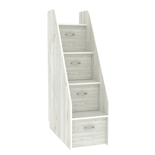 Лестница-комод с перилами предназначена для подъема на верхний ярус и хранения игрушек или одежды. Конструкция состоит из 4-х ступеней с ящиками, 3 являются выдвижными, а верхний служит ребром жесткости.