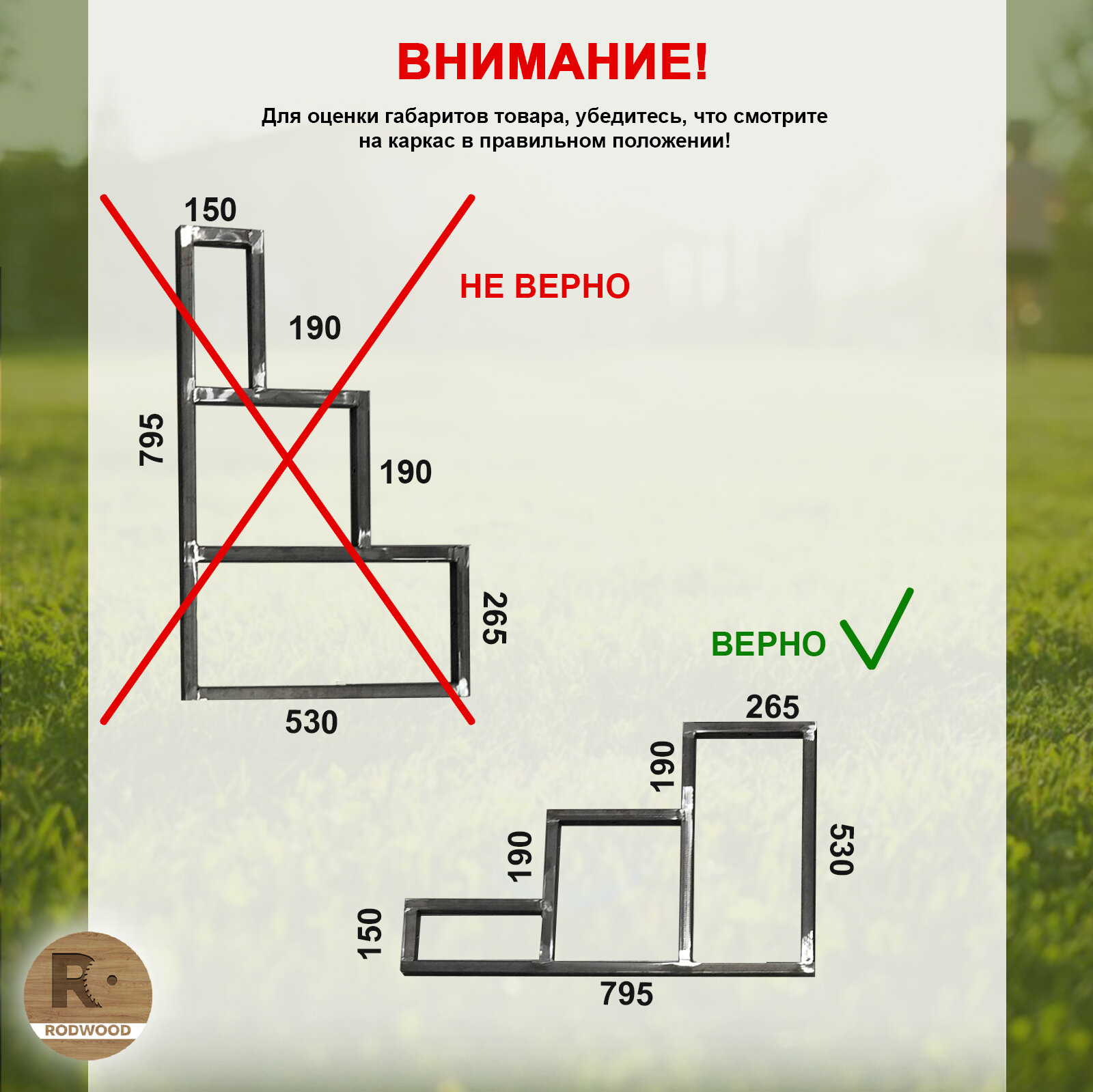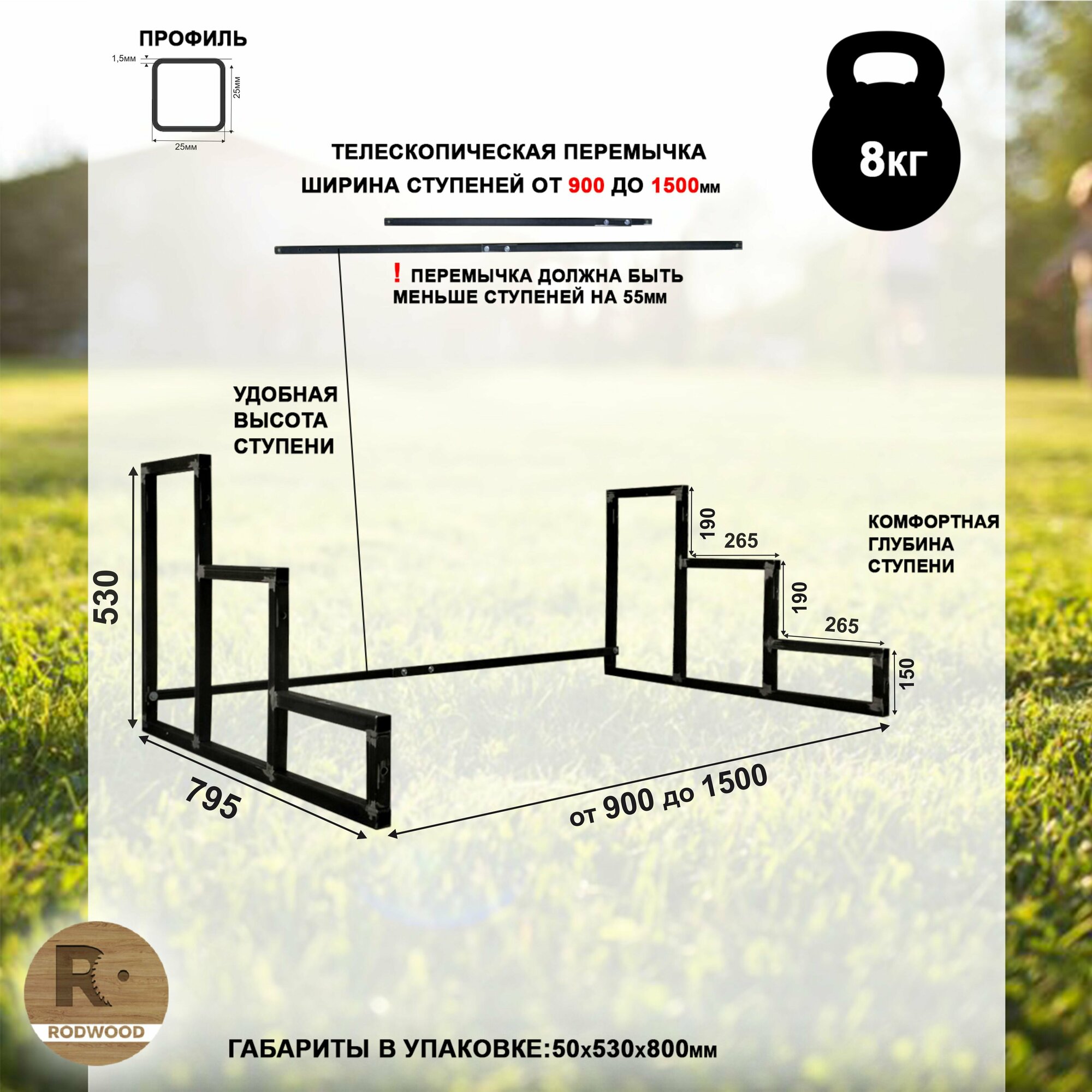 Габариты лестницы-крыльца составляют: Высота: 530мм, Ширина: до 1500мм, Глубина: 795мм