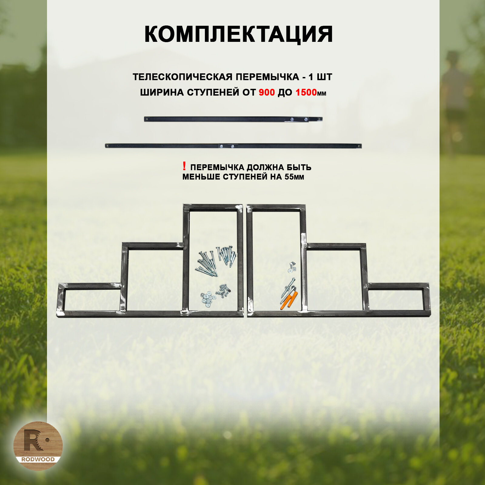 Комплектация: Стойки каркаса - 2 шт, телескопическая перемычка - 1 шт, крепеж - 1 компл. ступени, подступени И перила В комплект НЕ входят