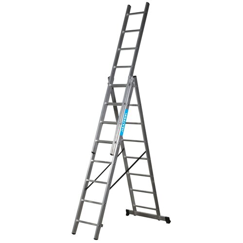 Профессиональная серия. Самый широкий в своем классе профиль сечением 62х20 мм. Усиленные кронштейны и ступени секций. Лестница алюминиевая трехсекционная - это универсальная раздвижная лестница стремянка, состоящая из 3 секций, в каждой секции 9 ступеней . Её можно использовать в виде приставной лестницы (все три секции раздвинуты в прямую линию) - для работ на стенах, столбах и других вертикальных поверхностях. И в виде лестницы-стремянки(перевернутая буква "У") - для потолочных работ, работ в саду и других задач, при выполнении которых лестницу возможно опереть только на горизонтальную поверхность. Длина лестницы увеличивается от минимальной до максимальной с шагом 26 см.