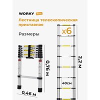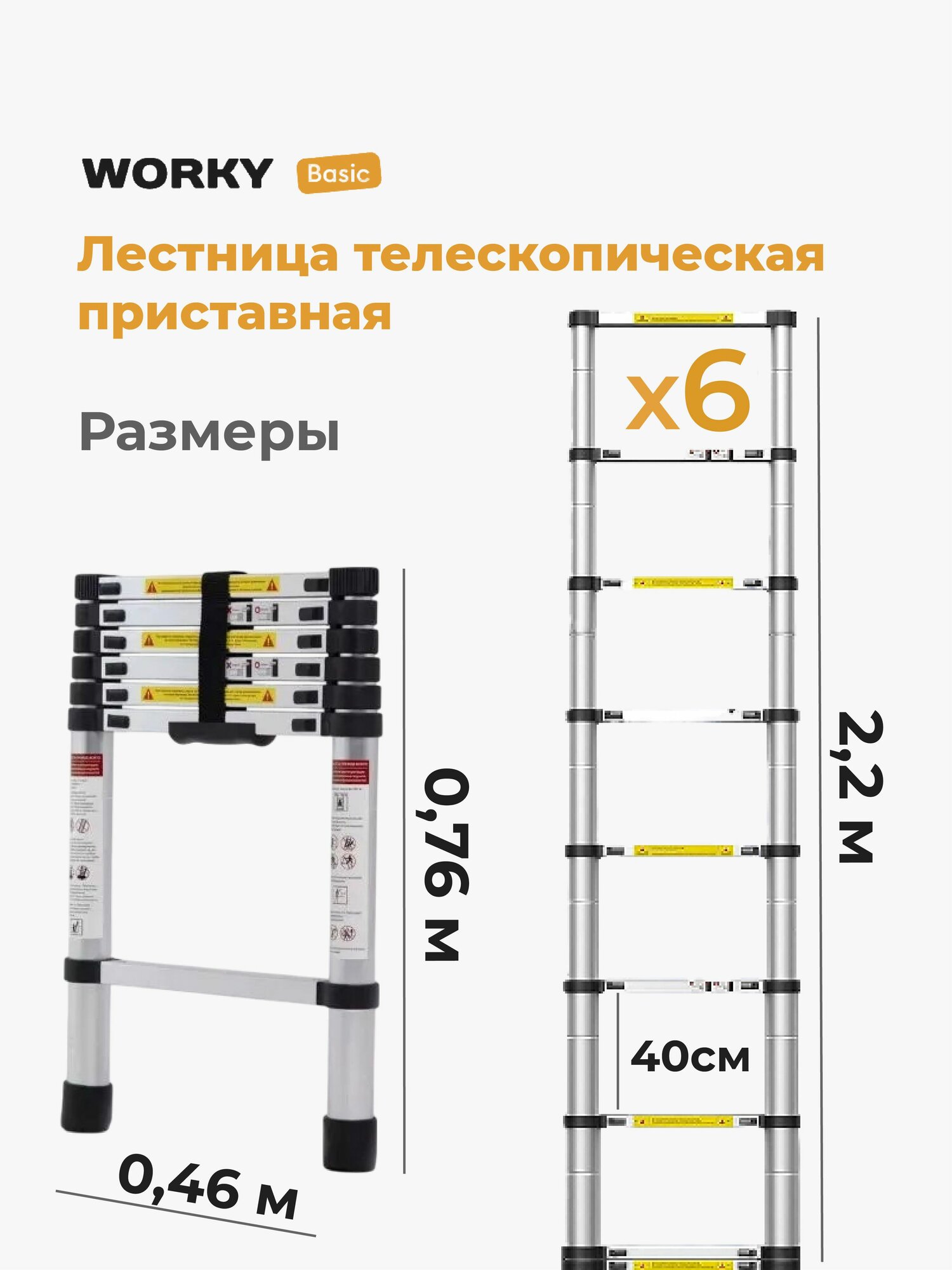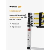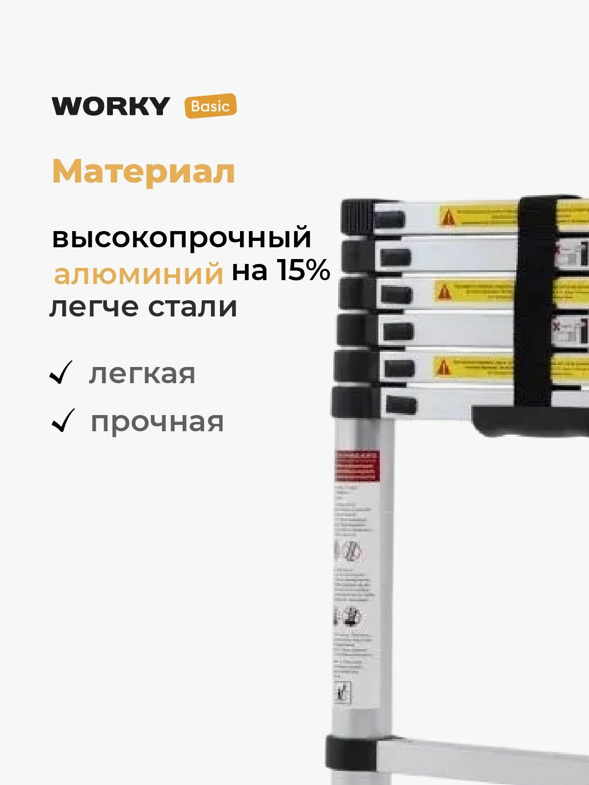 Телескопическая лестница WORKY изготовлена из высококачественного алюминия, что делает её легкой, прочной и устойчивой к коррозии. Это универсальное решение для работы на разной высоте и в сложных условиях.