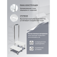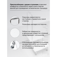 В ослабленном состоянии человеку тяжело не только мыться стоя, но и перелезать через борт ванны. Двойная лесенка с поручнем для ванной комнаты сможет облегчить пользование ванной и прием водных процедур. Ступенька станет надежной опорой в ежедневном уходе за больными и пожилыми людьми дома или в условиях стационара. Пользоваться раковиной и ванной с помощью этих реабилитационных устройств будет удобно и детям. Лестница для реабилитации состоит из двух ступенек и поручня, который можно установить как под правую, так и под левую руку или убрать совсем. Специальная накладка на нём не позволяет руке скользить. Новая модель ступеней для ванны имеет телескопический поручень, и его высота легко регулируется с учетом роста конкретного человека. 93-110 см. Рама из хромированной стали не подвергается коррозии. Ступени лесенки выполнены из прочного нескользящего пластика с ребристой поверхностью и отверстиями для стока воды. Покрытие ступенек выполнено из пластика, который обладает высокой прочностью и устойчивостью к нагрузкам. Подставка под ванну устойчива и не скользит по полу, благодаря резиновым наконечникам.