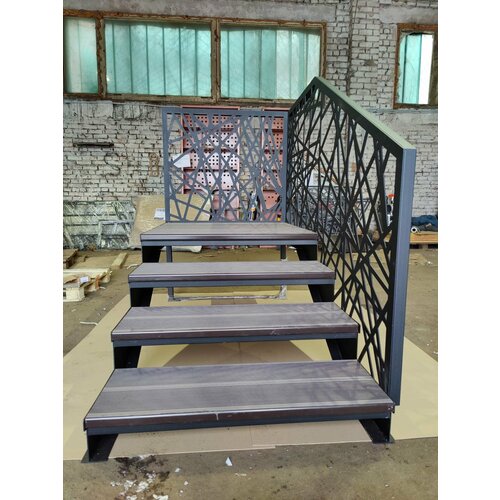 Лестница-Крыльцо имеет высоту 112 см сантиметра, ширину 130см и глубину 276 см. Размер площадки-1.3м*0.96м. Высота ступени-16 см, глубина-30см, ширина-1,3 м. Ограждения выполнены методом лазерной резки монолитно с основанием из цельного листа металла, с одной стороны по лестнице и площадке, а также с торца площадки. Каркас выполнен из листового металла. Покраска выполнена методом порошкового напыления, по умолчанию цвет черный матовый "муар". Так же возможен другой цвет.