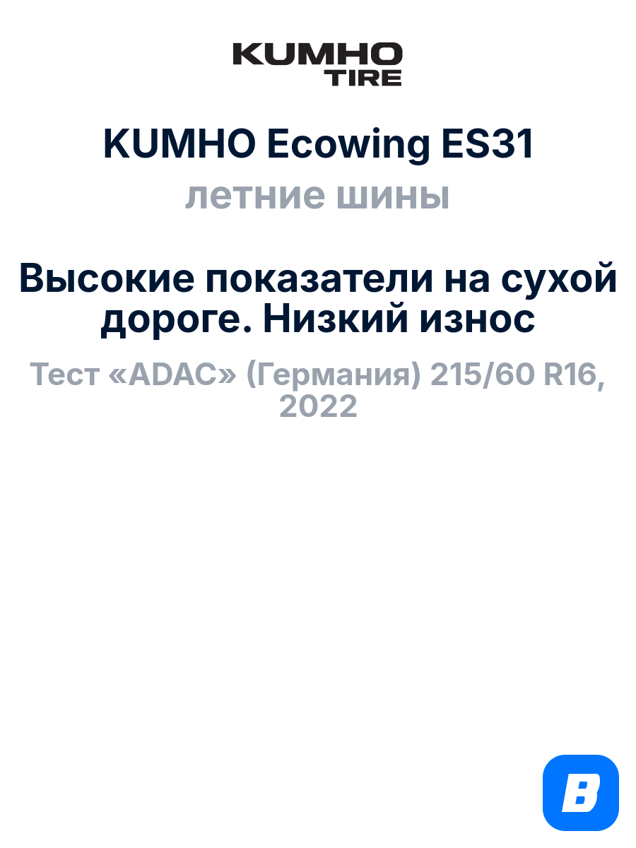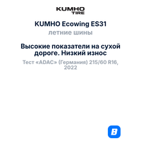 Автомобильные покрышки Kumho модель Ecowing ES31 - это правильный выбор для тех, кто ищет современные качественные и надежные летние шины.