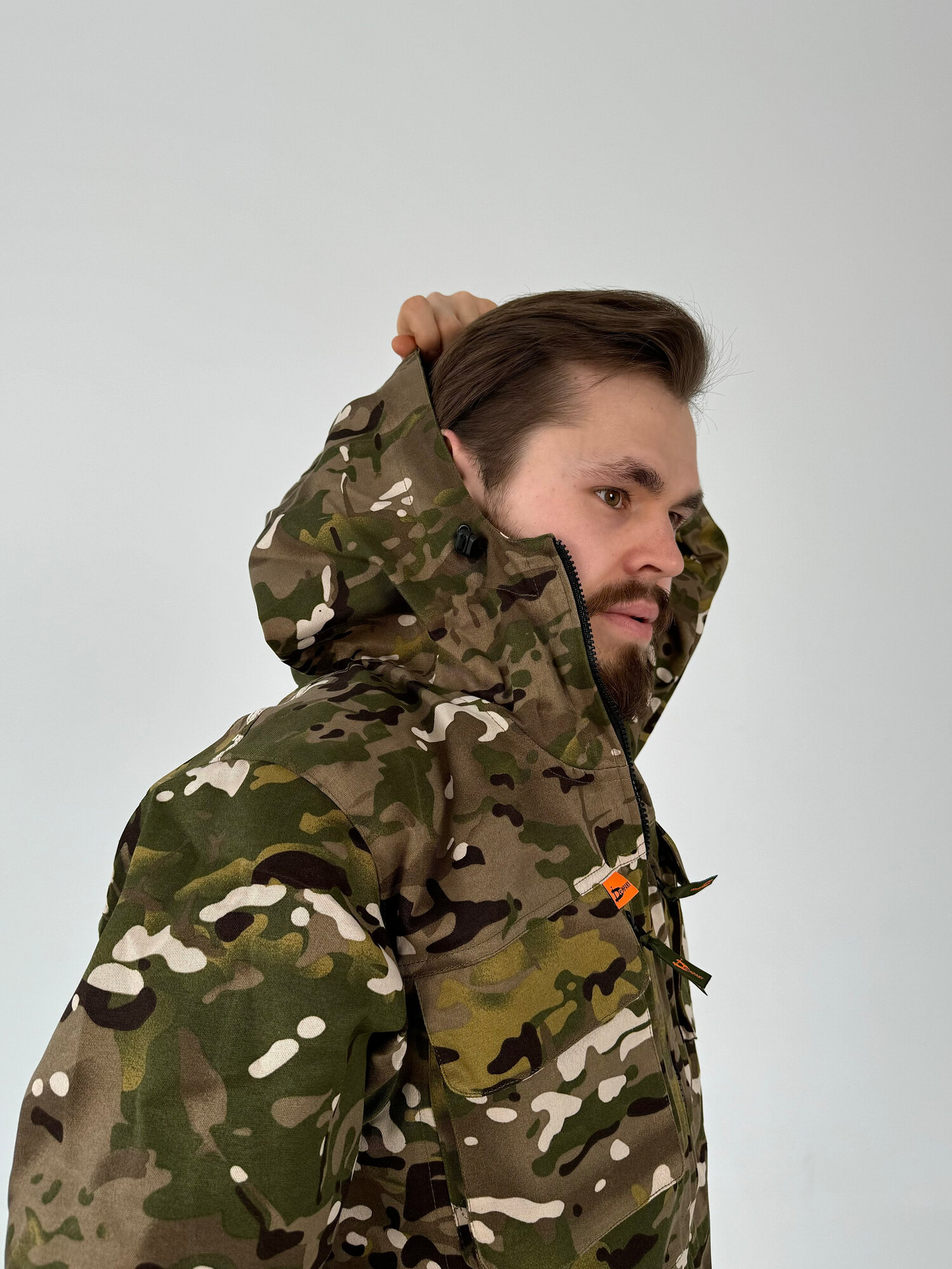 рукава: с манжетами; штаны: с карманами для вкладышей; карманы: на липучках, врезные, нагрудные, с клапанами, боковые, на молнии; капюшон: с подбородочной частью; воротник: высокий; активность: средняя; ширинка: на пуговицах, на молнии; Минимальная температура: 5°