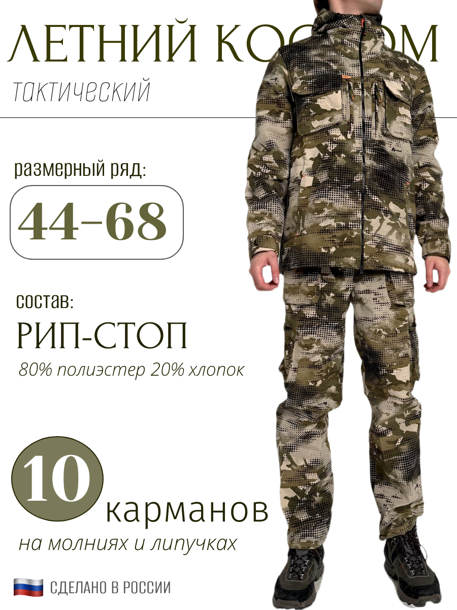 Основа — ткань Смесовая. Это приятный телу, дышащий материал. На куртке и брюках 10 карманов на липучках и молниях, чтобы ключи и документы были в надежном месте.