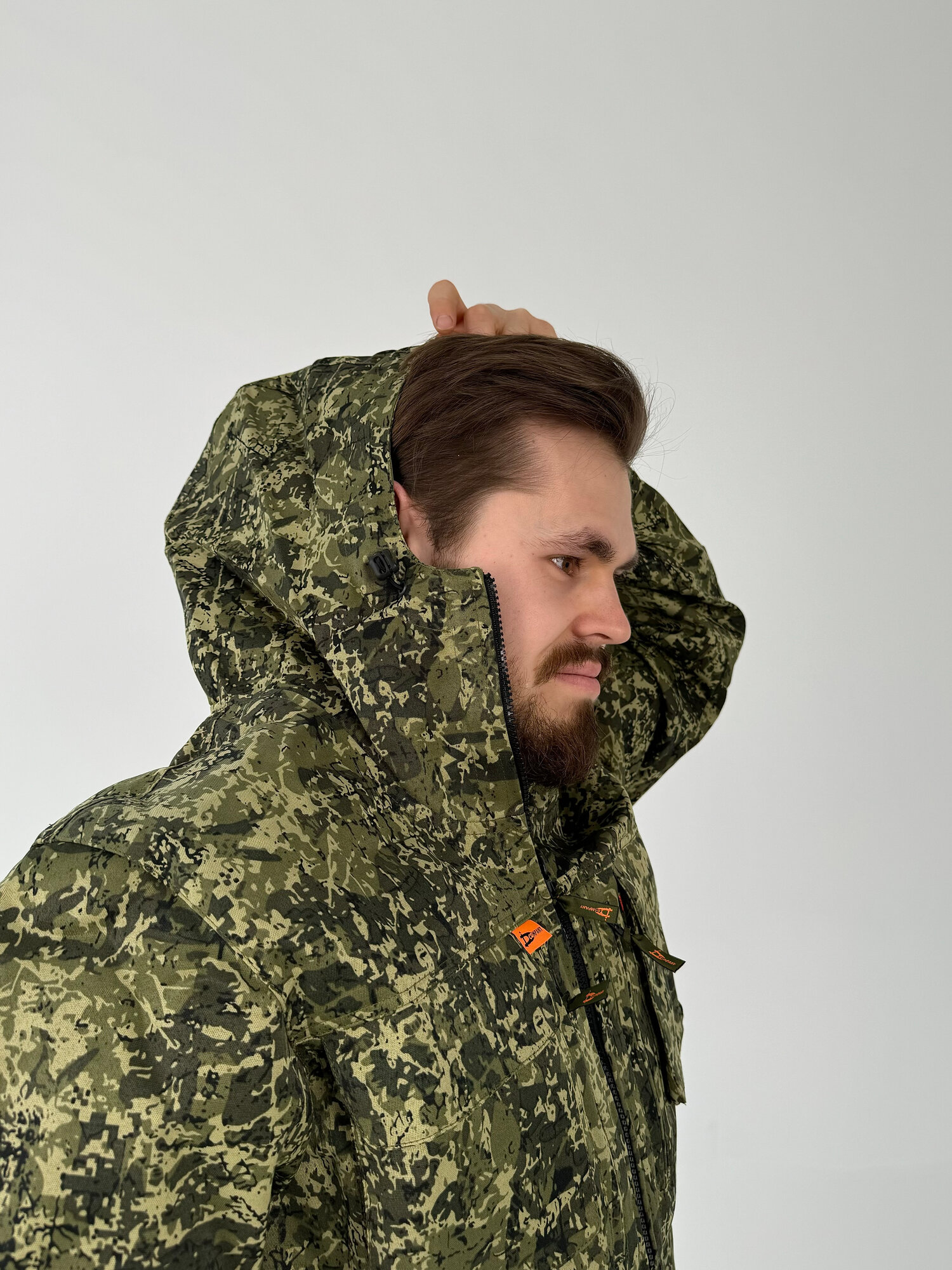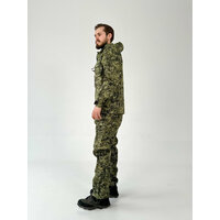 рукава: с манжетами; штаны: с карманами для вкладышей; карманы: на липучках, врезные, нагрудные, с клапанами, боковые, на молнии; капюшон: с подбородочной частью; воротник: высокий; активность: средняя; ширинка: на пуговицах, на молнии; Минимальная температура: 5°