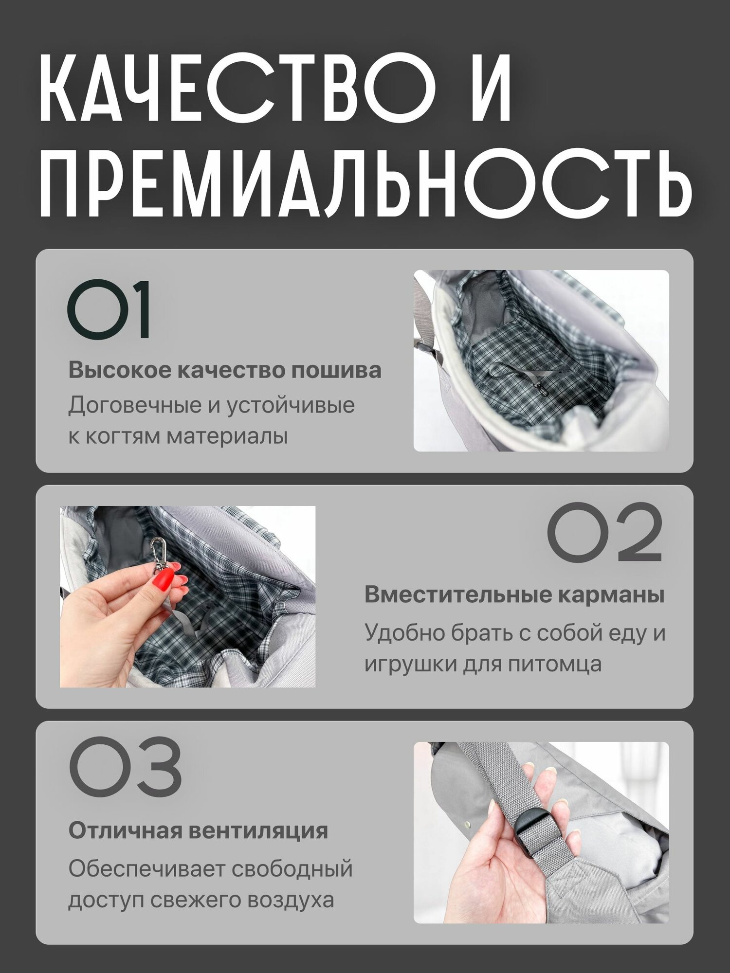На внешней части сумки и внутри предусмотрены карманы для личных вещей или необходимых аксессуаров для питомца. В карман поместятся телефон, ключи, документы и вкусняшки питомца. Все, что нужно на прогулке!