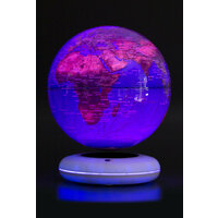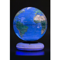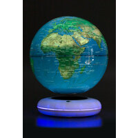 Левитационный глобус левитрон (D-20см) - глобус-левитрон, принцип работы которого аналогичен принципу работы электромагнитов, т. е. в глобус и подставку встроены магниты и катушка, создающие магнитное поле, благодаря которому глобус левитирует в воздухе. Данная модель глобуса имеет круглую подставку с двойной светодиодной подсветкой , которая также освещает сам глобус снизу. В рабочем состоянии глобус вращается.