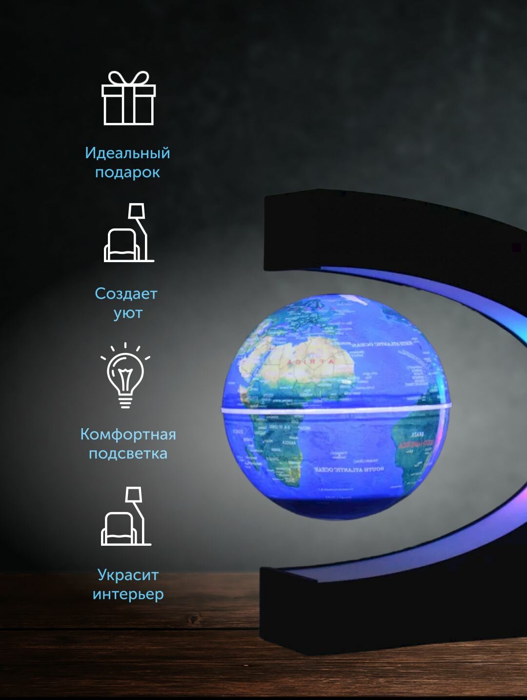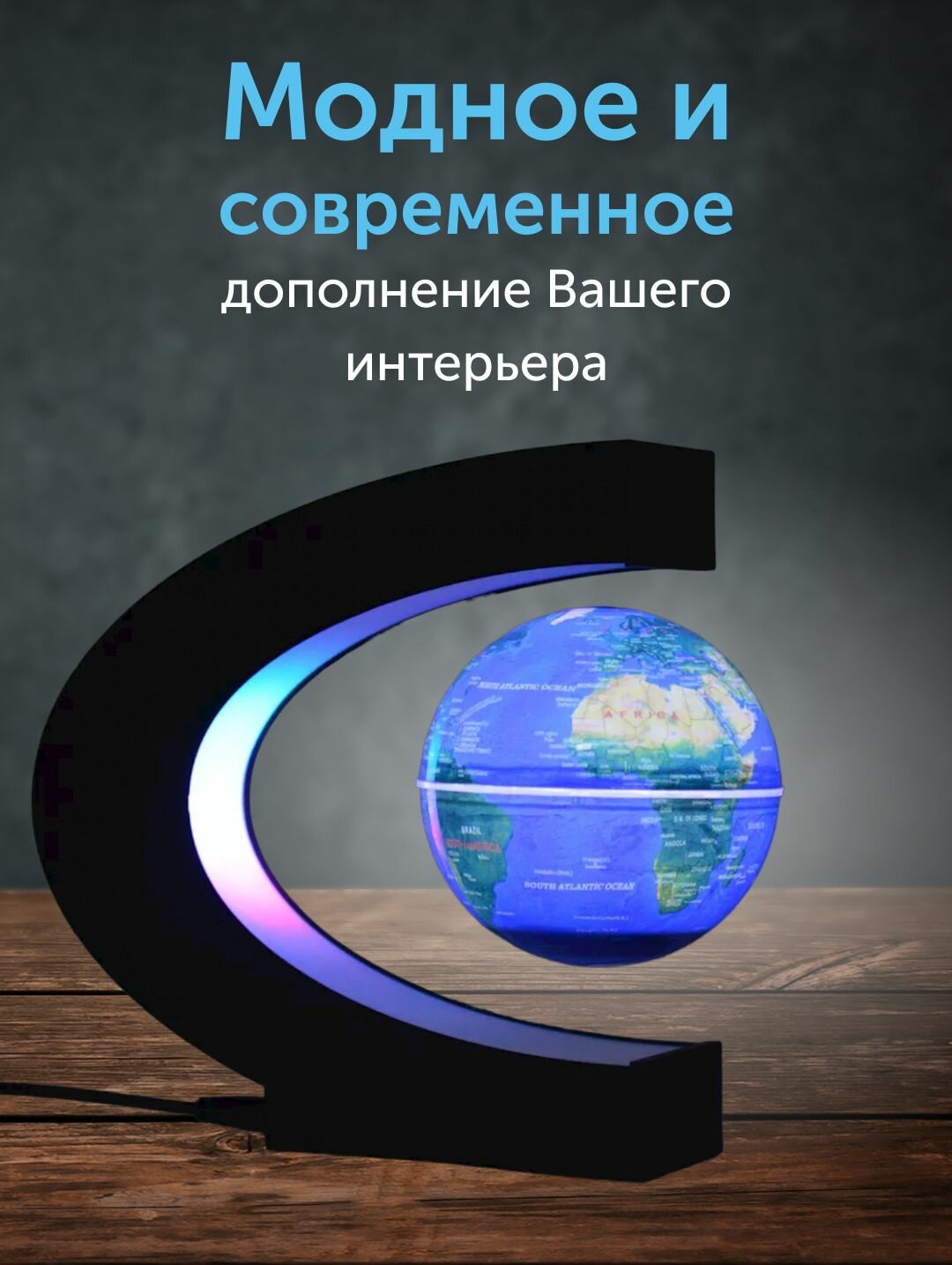 Этот удивительный летающий глобус серии "Floating" — не иллюзия и не фокус. Глобус действительно парит между двумя половинками подставки. Такой эффект осуществляется за счет четко настроенных электромагнитов. Левитирующий глобус — прекрасное украшение для любого интерьера, которое вызовет удивление у всех Ваших гостей. Глобус работает от обычной розетки с напряжением 220В. Украшение абсолютно безвредно. В рамке, между которой парит глобус, установлена LED подсветка, которая мягко переливается разными цветами, а в самом шаре установлена подсветка, которая подсвечивает шар изнутри. Как пользоваться? Поставьте подставку на ровную поверхность. Обратите внимание, что поверхность должна быть полностью ровной, без наклона и без вибраций. Подключите подставку в сеть 220В. Возьмите глобус и пластиковый стик, идущий в комплекте. Прижмите стик к верхней точке глобуса. Плавно поместите глобус стиком вверх в подставку. Попробуйте немного подвигать глобус в разные стороны, чтобы найти точку, в которой глобус начнет парить. В такой точке вы почувствуете силу, которая будет поддерживать глобус на высоте примерно 12-15 миллиметров над подставкой. После этого, аккуратно отпустите глобус, и вытащите стик. Перед тем как отключить левитационный глобус от сети, необходимо сначала вынуть парящий шар и убрать его. Если полминуты не возникает эффекта левитации глобуса, значит, у адаптера, находящегося внутри него, автоматически включился защитный режим. Необходимо вынуть глобус, убрать на минуту, затем установить снова на прежнюю точку. Меры предосторожности: Подставка глобуса должна находится на ровной поверхности Не держите рядом металлические предметы или электронные устройства Запрещено использовать людям с кардиостимулятором Рекомендуется для использования с 12 лет Для использования в помещениях Характеристики: Диаметр: 8,5 см Размер упаковки: 21,5 х 21,5 х 10 см Размер рамки: 17,5 х 17,5 х 5 см Длина провода: 92,5 см Вес: 288 г Карта: Топографическая На карту нанесены континенты, моря, океаны, горы. В комплекте: рамка, глобус и адаптер