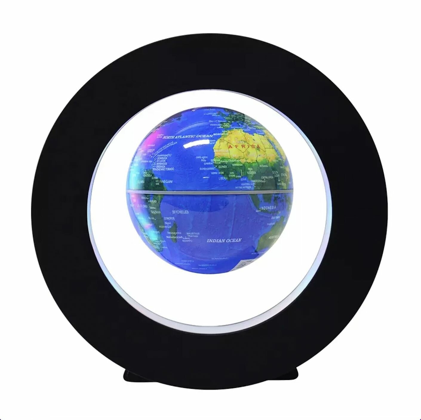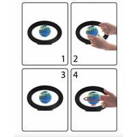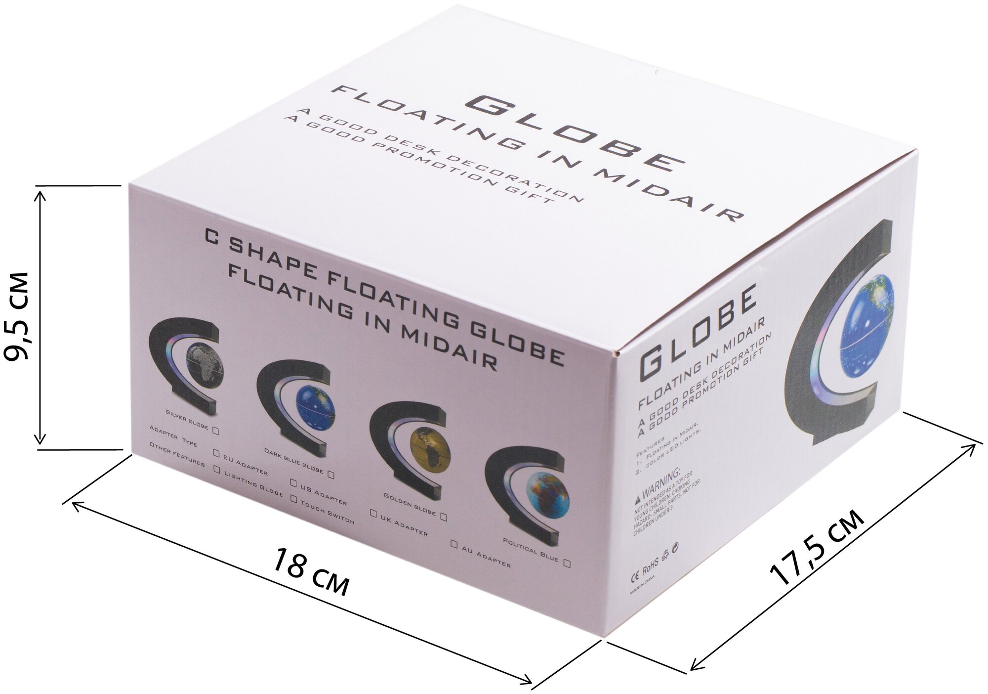 ·Левитирующий глобус серии "Floating". Этот удивительный летающий глобус — не иллюзия и не фокус. Глобус действительно парит между двумя половинками подставки. Такой эффект осуществляется за счет четко настроенных электромагнитов. Левитирующий глобус — прекрасное украшение для любого интерьера, которое вызовет удивление у всех Ваших гостей. Глобус работает от обычной розетки с напряжением 220В. Украшение абсолютно безвредно. В рамке, между которой парит глобус, установлена LED подсветка, которая мягко переливается разными цветами. Как пользоваться? Поставьте подставку на ровную поверхность. Обратите внимание, что поверхность должна быть полностью ровной, без наклона и без вибраций. Подключите подставку в сеть 220В. Возьмите глобус и пластиковый стик, идущий в комплекте. Прижмите стик к верхней точке глобуса. Плавно поместите глобус стиком вверх в подставку. Попробуйте немного подвигать глобус в разные стороны, чтобы найти точку, в которой глобус начнет парить. В такой точке вы почувствуете силу, которая будет поддерживать глобус на высоте примерно 12-15 миллиметров над подставкой. После этого, аккуратно отпустите глобус, и вытащите стик. Перед тем как отключить левитационный глобус от сети, необходимо сначала вынуть парящий шар и убрать его. Если полминуты не возникает эффекта левитации глобуса, значит, у адаптера, находящегося внутри него, автоматически включился защитный режим. Необходимо вынуть глобус, убрать на минуту, затем установить снова на прежнюю точку. Меры предосторожности: Подставка глобуса должна находится на ровной поверхности Не держите рядом металлические предметы или электронные устройства Запрещено использовать людям с кардиостимулятором Рекомендуется для использования с 12 лет Для использования в помещениях Характеристики: Диаметр: 8,5 см Размер упаковки: 21,5 х 21,5 х 10 см Размер рамки: 17,5 х 17,5 х 5 см Длина провода: 92,5 см Вес: 288 г Карта: Топографическая На карту нанесены континенты, моря, океаны, горы. В комплекте: рамка, глобус и адаптер