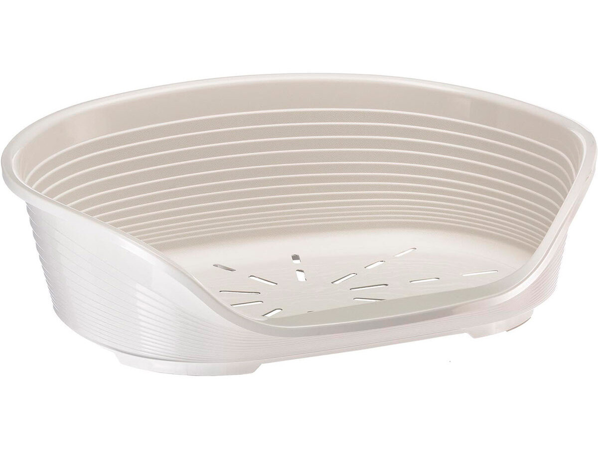 Уютный пластиковый лежак овальной формы. Обратите ваше внимание на дизайн лежака: он имеет бортики сзади и по бокам, спереди идет открытая зона с ровной поверхностью. Лежак оснащен антискользящими опорами, а нижняя часть имеет перфорацию для циркуляции воздуха.
