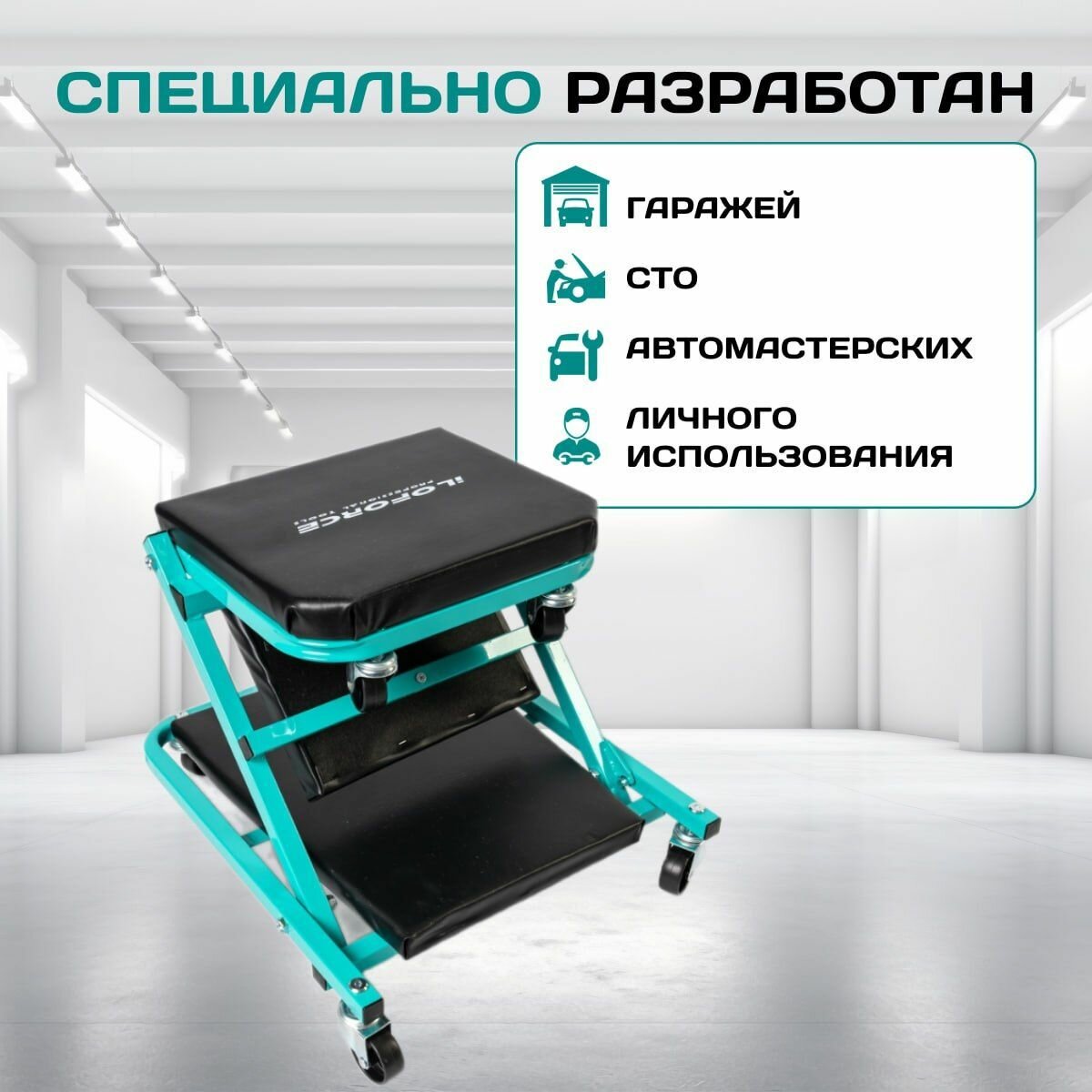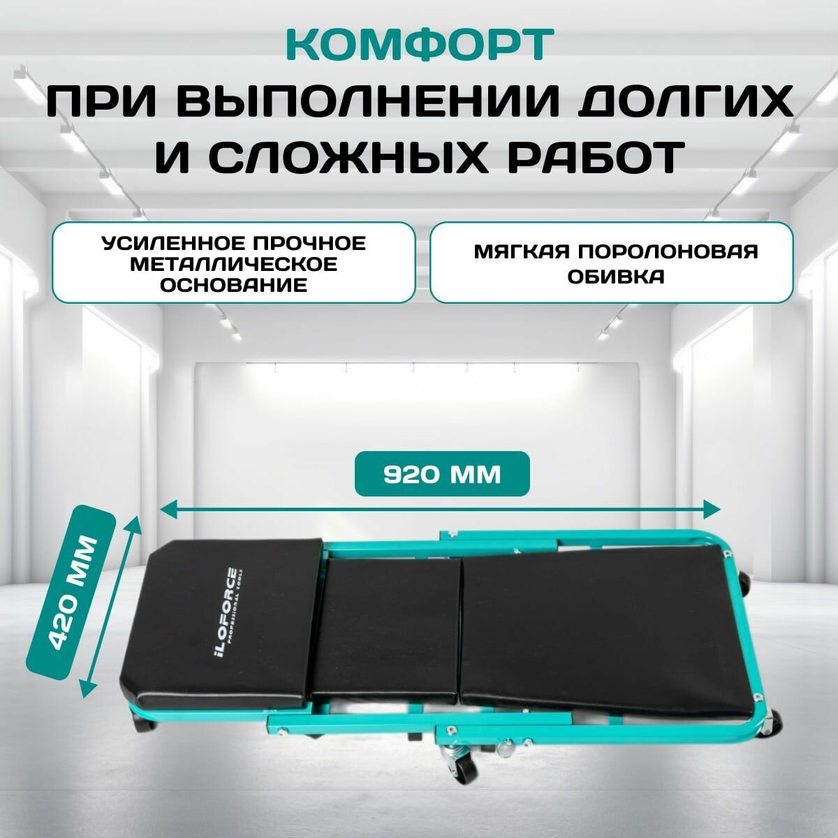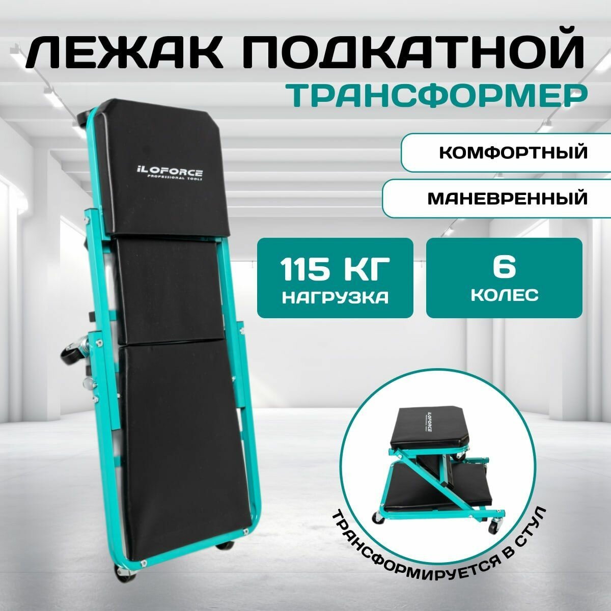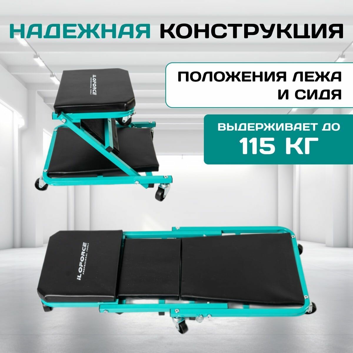 Стул - лежак ремонтный от бренда ILOforce идеально подходит для работы в автомобильных сервисах и гаражах. Этот многофункциональный трансформер может использоваться как в сложенном, так и в разложенном виде, обеспечивая универсальность и удобство. Изготовлен из прочного материала, гарантирующего долговечность и надежность. Устройство оснащено шестью поворотными колесами для легкого и свободного перемещения. Размер в разложенном виде 910 х 410 х 120 мм обеспечивает достаточно места для комфортного расположения пользователя, позволяя выполнять ремонтные работы без каких-либо ограничений. Максимальная нагрузка на лежак составляет 150 кг. Размеры стула 460 х 410 х 360 мм, максимальная нагрузка на стул до 120 кг. Мягкий поролоновый наполнитель обеспечивает комфорт и удобство во время ремонтных работ. Конструкция позволяет пользователю долгое время находиться в лежачем или сидячем положении без ощущения дискомфорта.