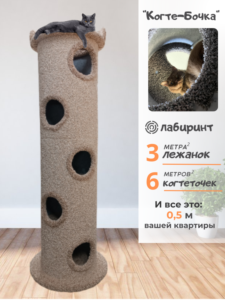 Игровой комплекс для кошек "Когте-Бочка" лабиринт 200 см от бренда Chauzi представляет собой идеальное развлечение для вашего питомца. Для кошек лазание является инстинктивным и неотъемлемой частью их физиологии - для нас предоставление кошкам возможности лазать является фундаментальной частью их благополучия, как выгул вашей собаки. Этот многоуровневый комплекс, изготовленный из плотного мебельного ДСП, фанеры и очень качественного ковролина, предлагает вашему коту 6 уровней для исследования и 6 уютных лежанок для отдыха. Гипоаллергенный материал гарантирует комфорт и безопасность вашего питомца. Комплекс включает в себя домики, лабиринт и когтеточку, что делает его не только игровой, но и полезным для ухода за когтями. Напольная установка обеспечивает простоту размещения в любой комнате. "Когте-Бочка" - отличный выбор для тех, кто хочет предоставить своему коту максимальную заботу о его здоровье, развлечение и комфорт. Мы даем гарантию 6 месяцев на комплекс.