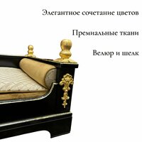 Внутренняя часть лежанки представляет собой матрас, два декоративных валика и шикарную подстилку выполненные из велюра и шелка. Лежанка возможно изготовить в цветах на выбор: черный, коричневый, серый, бежевый, слоновая кость с оформлением поталью также на выбор: серебро или золото.