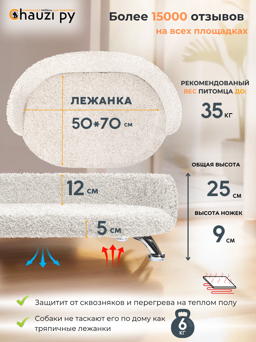 Высота ножек 9,5 см от пола. Диванчик не собирает пыль и шерсть вокруг себя, удобен для уборки в доме. За счет высоты ножек, питомец защищен от сквозняков по полу. Наши питомцы любят комфорт и уют и для сна и отдыха. Они часто выбирают кровать или любимый диван своего владельца. Но хозяин может быть против соседства с шерстью, для комфорта каждого мы разработали данную лежанку диван. Она прекрасно подойдет для собак и кошек, которые больше не будут искать место для отдыха. Ни для кого не секрет, что любимцам необходима своя территория в доме, где они будут чувствовать себя спокойно и независимо. Лежанка - идеальный вариант для создания индивидуальной зоны, для домашних питомцев. Уютное место для домашних любимцев.