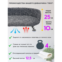 Высота ножек 9,5 см от пола. Диванчик не собирает пыль и шерсть вокруг себя, удобен для уборки в доме. За счет высоты ножек, питомец защищен от сквозняков по полу. Наши питомцы любят комфорт и уют и для сна и отдыха. Они часто выбирают кровать или любимый диван своего владельца. Но хозяин может быть против соседства с шерстью, для комфорта каждого мы разработали данную лежанку диван. Она прекрасно подойдет для собак и кошек, которые больше не будут искать место для отдыха. Ни для кого не секрет, что любимцам необходима своя территория в доме, где они будут чувствовать себя спокойно и независимо. Лежанка - идеальный вариант для создания индивидуальной зоны, для домашних питомцев. Уютное место для домашних любимцев.