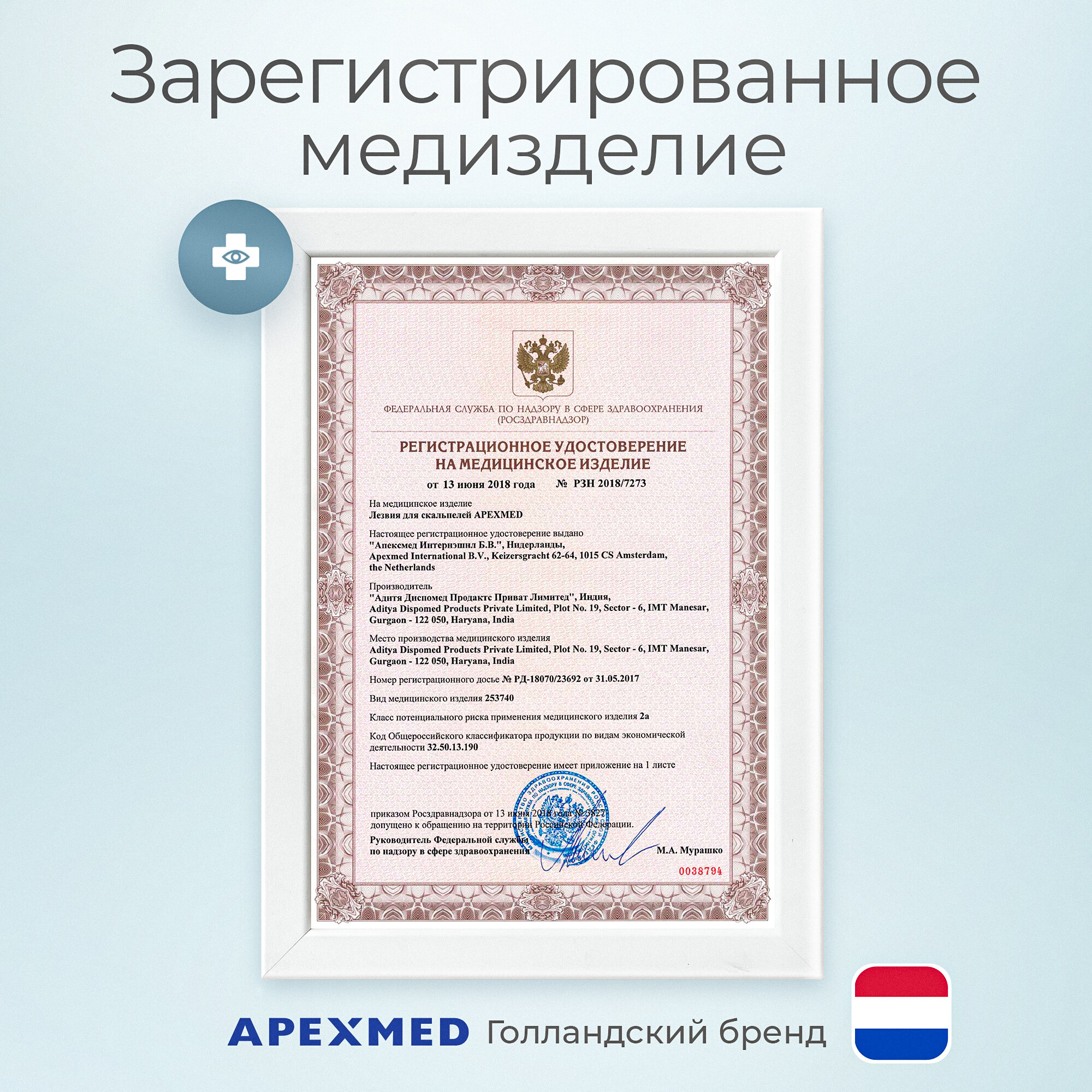 Лезвия Apexmed для скальпеля изготовлены из высокоуглеродистой стали, стерилизованы гамма-излучением, имеют регистрационное удостоверение медицинского изделия. Лазерный контроль заточки и полировка режущего края обеспечивают превосходные режущие свойства, необходимые для идеальных результатов в каждой операции.