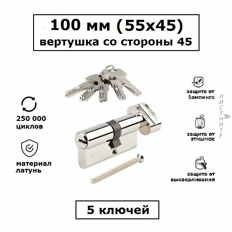 Личинка замка 100 мм (55х45) с вертушкой со стороны 45 и перфоключами Apecs SM никель цилиндровый механизм: сравнение цен, характеристики, фото, актуальное наличие и цены.