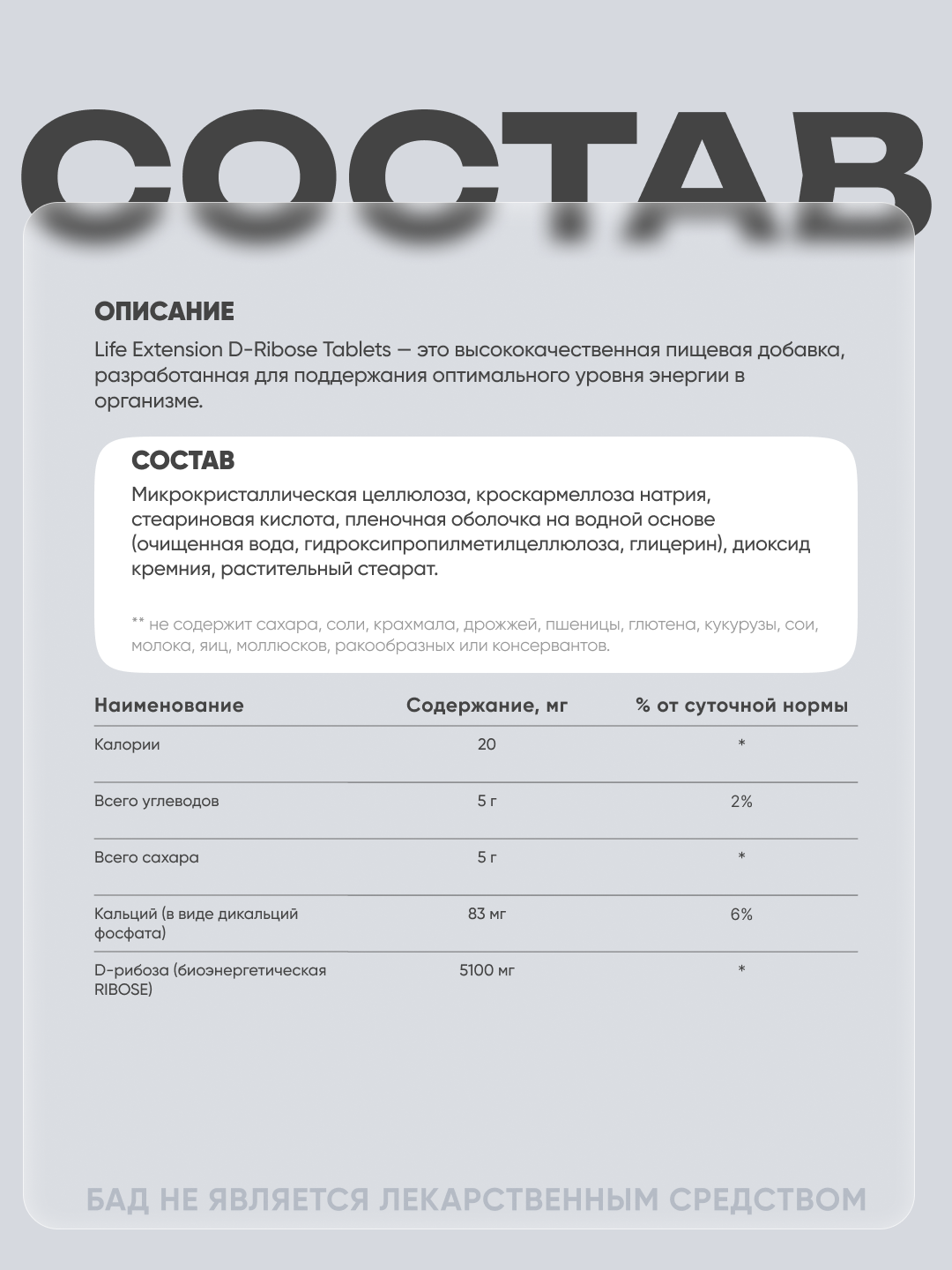- Продолжение использования необходимо для сохранения преимуществ таблеток D-рибозы.
