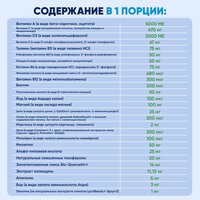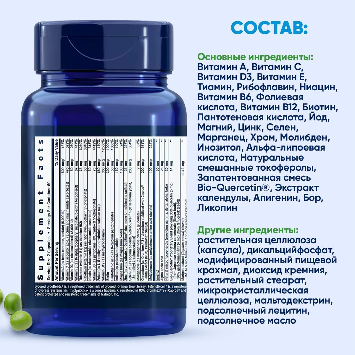Витамин A (в виде бета-каротина, ацетата) (5000 МЕ) 1500 мкг^ 167% Витамин С (в виде аскорбиновой кислоты, кальция и аскорбатов никотинамида) 470 мг 522% Витамин D3 (в виде холекальциферола) (2000 МЕ) 50 мкг 250% Витамин E (в виде сукцината d-альфа-токоферила, D-альфа-токоферола) 67 мг 447% Тиамин (витамин B1) (в виде гидрохлорида тиамина) 75 мг 6250% Рибофлавин (витамин B2) (в виде рибофлавина, рибофлавин 5'-фосфата) 50 мг 3846% Ниацин (в виде никотинамида, никотинамида аскорбата) 50 мг* 313% Витамин B6 (в виде пиридоксина гидрохлорида, пиридоксала 5-фосфата) 75 мг 4412% Фолат (в виде соли кальция L-5-метилтетрагидрофолата) 680 мкг° 170% Витамин B12 (в виде метилкобаламина) 300 мкг 12 500%Биотин 300 мкг 1000% Пантотеновая кислота (в виде d-пантотената кальция) 50 мг 1000% Йод (в виде йодида калия) 150 мкг 100% Магний (в виде оксида магния) 100 мг 24% Цинк (в виде цитрата цинка, сульфата моно-L-метионина цинка L-OptiZinc®) 25 мг 227% Селен [в виде селенита натрия, дрожжей с высоким содержанием селена SelenoExcell®, Se-метил L-селеноцистеина] 200 мкг 364% Марганец (в виде цитрата марганца, глюконата) 2 мг 87% Хром [в виде стабилизированного хрома Crominex® 3+ с экстрактом амлы (плоды) Capros®, мумие PrimaVie®] 200 мкг 571% Молибден (в виде аминокислотного хелата молибдена) 100 мкг 222% Инозитол 50 мг ** Альфа-липоевая кислота 25 мг ** Натуральная смесь токоферолов (содержит гамма-, дельта-, альфа- и бета-токоферолы) 20 мг ** Фитосома биокверцетина (содержит 5 мг кверцетина [из концентрата бутонов цветка софоры японской], фосфатидилхолиновый комплекс [из подсолнечника]) 15 мг ** Экстракт бархатцев (Tagetes erecta, цветы), [станд. до 5 мг транс-лютеина, 155 мкг транс-зеаксантина] 11,12 мг ** Апигенин 5 мг ** Бор (в виде аминокислотного хелата бора) 3 мг ** Ликопин [из натурального экстракта томатов (плоды) LycoBeads®] 1 мг