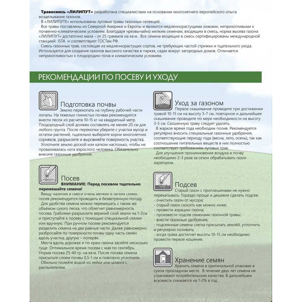 Смесь газонных трав, состоящая из низкорастущих сортов, не требующих частой стрижки и тщательного ухода. Используется для создания газонов высокого качества в парках, садах, вокруг коттеджей и загородных домов. Отличается неприхотливостью к плодородию почв и климатическим условиям. Газон лилипут разработан специалистами на основании многолетнего европейского опыта возделывания газонов. В газонной траве лилипут использованы 5 луговых трав газонных селекций. Все травы поставлены из Канады и Европы и являются медленнорастущими злаками, неприхотливыми к почвенно-климатическим условиям. Благодаря чрезвычайно мелким семенам, входящим в смесь, норма высева газона лилипут достаточно мала - от 35 граммов на кв. м. Все семена, входящие в смесь, сертифицированы международной инстанцией ISTA и соответствуют ГОСТ РФ, отличаются высокими биологическими показателями и обладают устойчивостью ко многим неблагоприятным факторам окружающей среды (устойчивы к вытаптыванию, засухо- и морозоустойчивы, теневыносливы и т. д.). Зеленый Ковер является одним из лидеров российского рынка в сфере импорта газонных трав и производства фасованных травосмесей. - Нашими поставщиками являются ведущие мировые производители семян из Канады и стран Европейского сообщества. Мы предлагаем своим покупателям неизменно высокое качество и широчайший ассортимент газонных травосмесей. - Компания "Зеленый Ковер" успешно работает на рынке товаров для благоустройства и озеленения с 1994 г. - На протяжении долгих лет основным видом деятельности является продажа семян, удобрений, а также популяризация культуры создания натуральных газонных покрытий. Перед тем как посадить газонную траву, нужно избавиться от мусора, сорняков, желательно максимально убрать корни растений. Для этого используют специальные гербициды полного действия. Как вариант, в целях освобождения почвы от семян сорных трав осуществляют рыхление всего участка. - На первом этапе очень важно подготовить наилучшим образом место для будущего ковра – ведь после посева не выкорчеванные растения активно начнут прорастать и тем самим портить всю общую картину. - Если в ваши планы входит получение газона с высокими декоративными свойствами, понадобится выравнивание нижнего слоя почвы, что неизбежно повлечет за собой снятие верхнего слоя грунта с последующим возвращением его на прежнее место после проведения соответствующих манипуляций. В случае устройства газона на крутом склоне целесообразно использование газонной сетки. - Особую важность имеет подготовка грунта. Газонные травы любят супесчаные легкие почвы. Поэтому при их посеве в глинистый субстрат предварительно следует насыпать песок на верхний слой грунта. - Песчаную же почву обогащают низинным торфом. - После грунт перекапывают, вследствие чего он приобретает нужные качества. - Вдобавок это мероприятие создает лучший дренаж. На этапе зональной планировки решают, каким образом правильно посадить газонную траву так, что бы та разбивала пространство на нужные участки. Газон должен выглядеть не только ухоженно, но и гармонировать с общей тематикой вашей площадки, украшать территорию перед домом. А уже после того, как Вы определились с проблемой, какую именно траву выбрать, можно будет дополнительно внести на лужайку элементы ландшафтного д